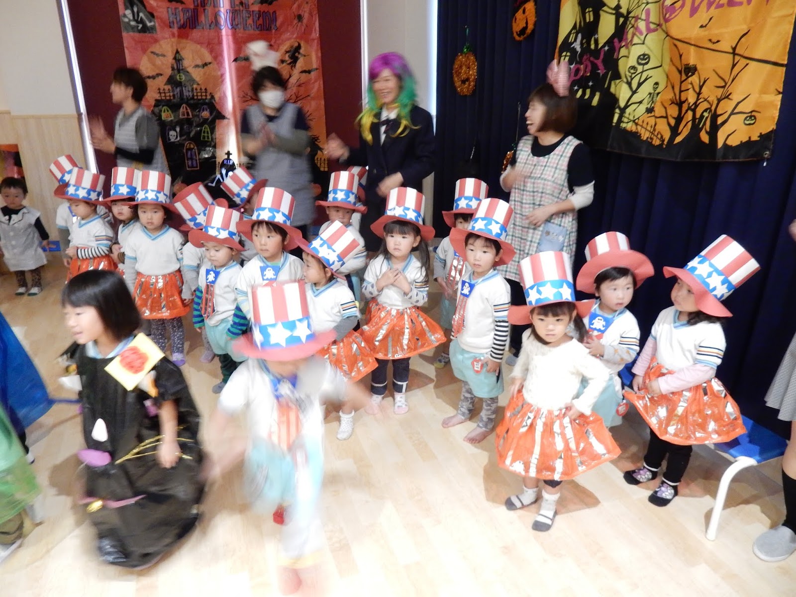 ハロウィンに関する英単語を教えてもらったり、キャンディー先生の手品を見たり、盛り上がったのはパーティーソングに合わせてのダンスタイム!毎年、今流行りの曲を1曲選んでみんなで楽しくダンスするんですが、今年は『U.S.A 』でした!ハロウィン…はあまり関係ないかもしれませんが(笑)子どもも大人も大盛り上がりでダンス、ダンス!おかげで写真はブレブレです!