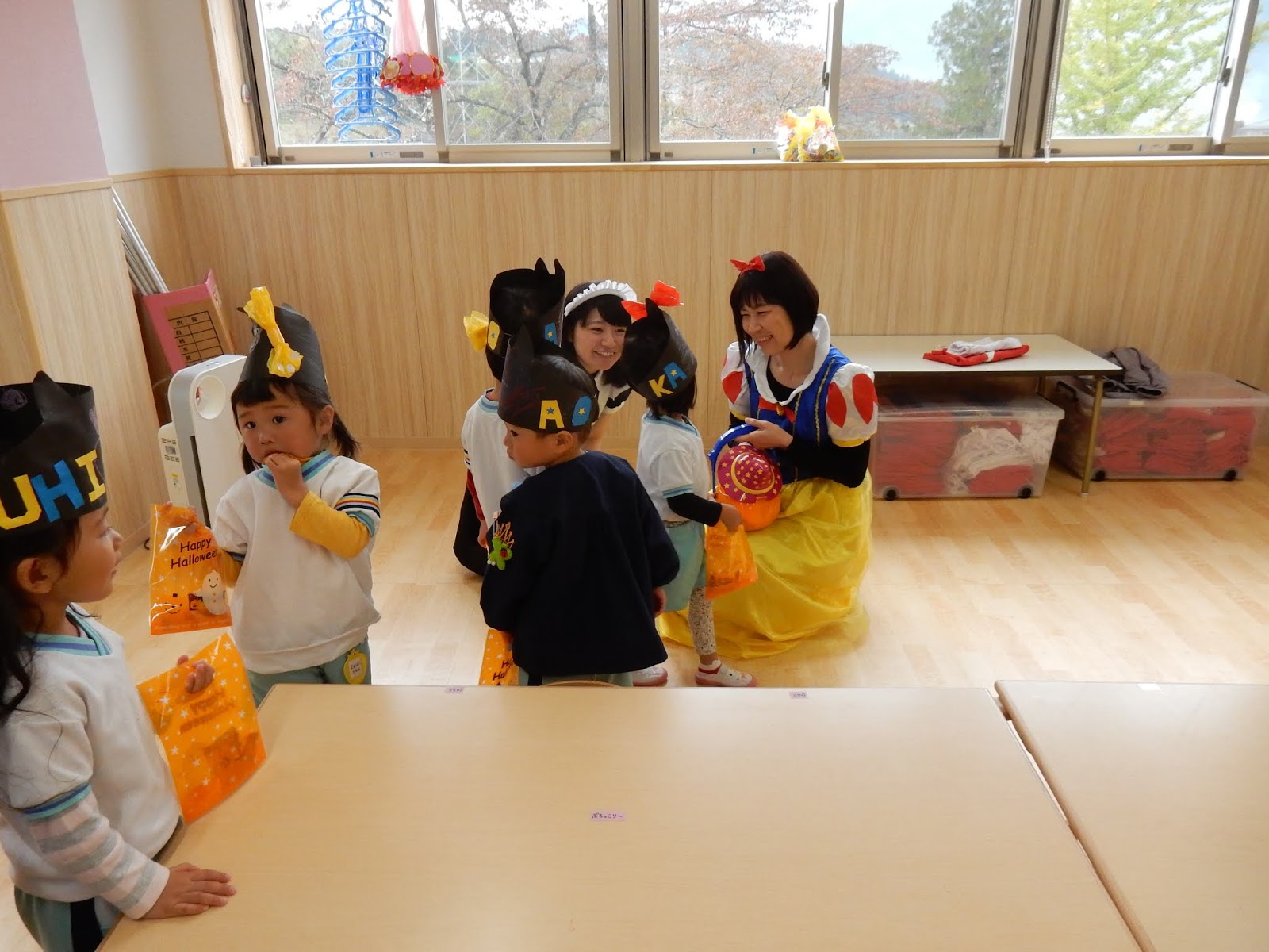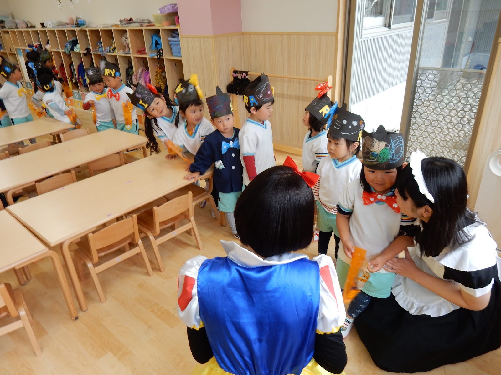 ハロウィンパーティーで子どもたちが一番楽しみにしている時間といえば、もちろんお菓子をもらうこと。カボチャになったキャンディー先生の他にも、白雪姫からもお菓子をもらいました。大きいお友達は、『trick or treat!!』と英語でお話。お菓子をもらったあとは、『thank you!』とお礼を言うことも忘れません!