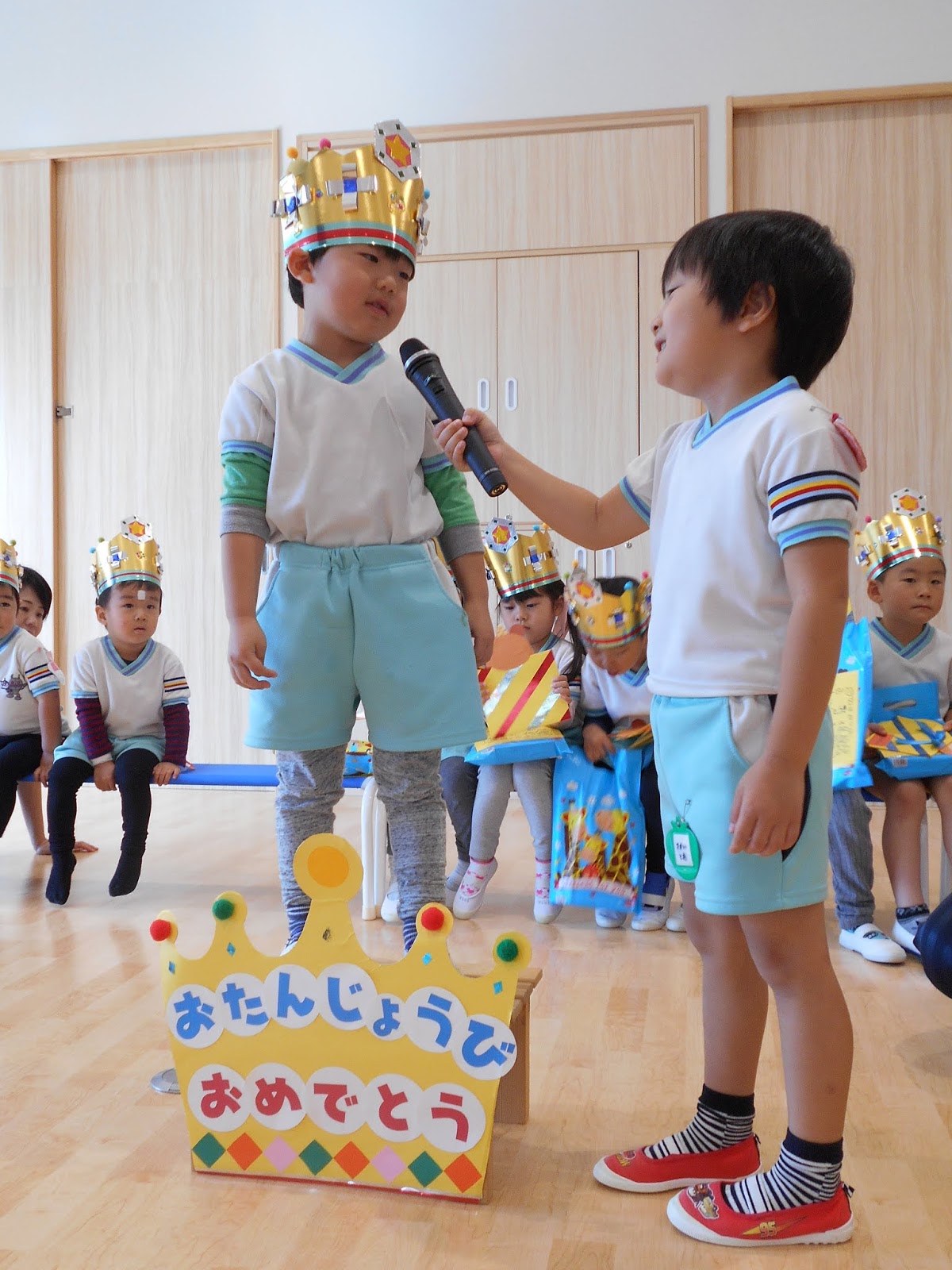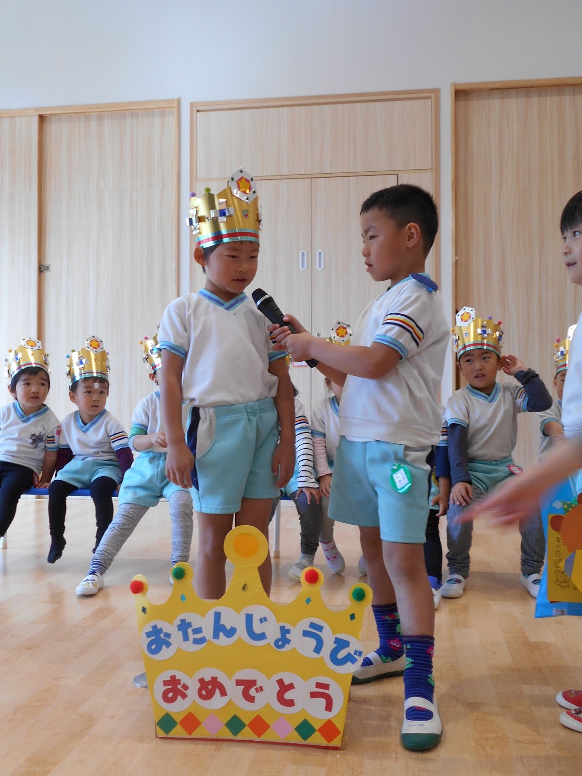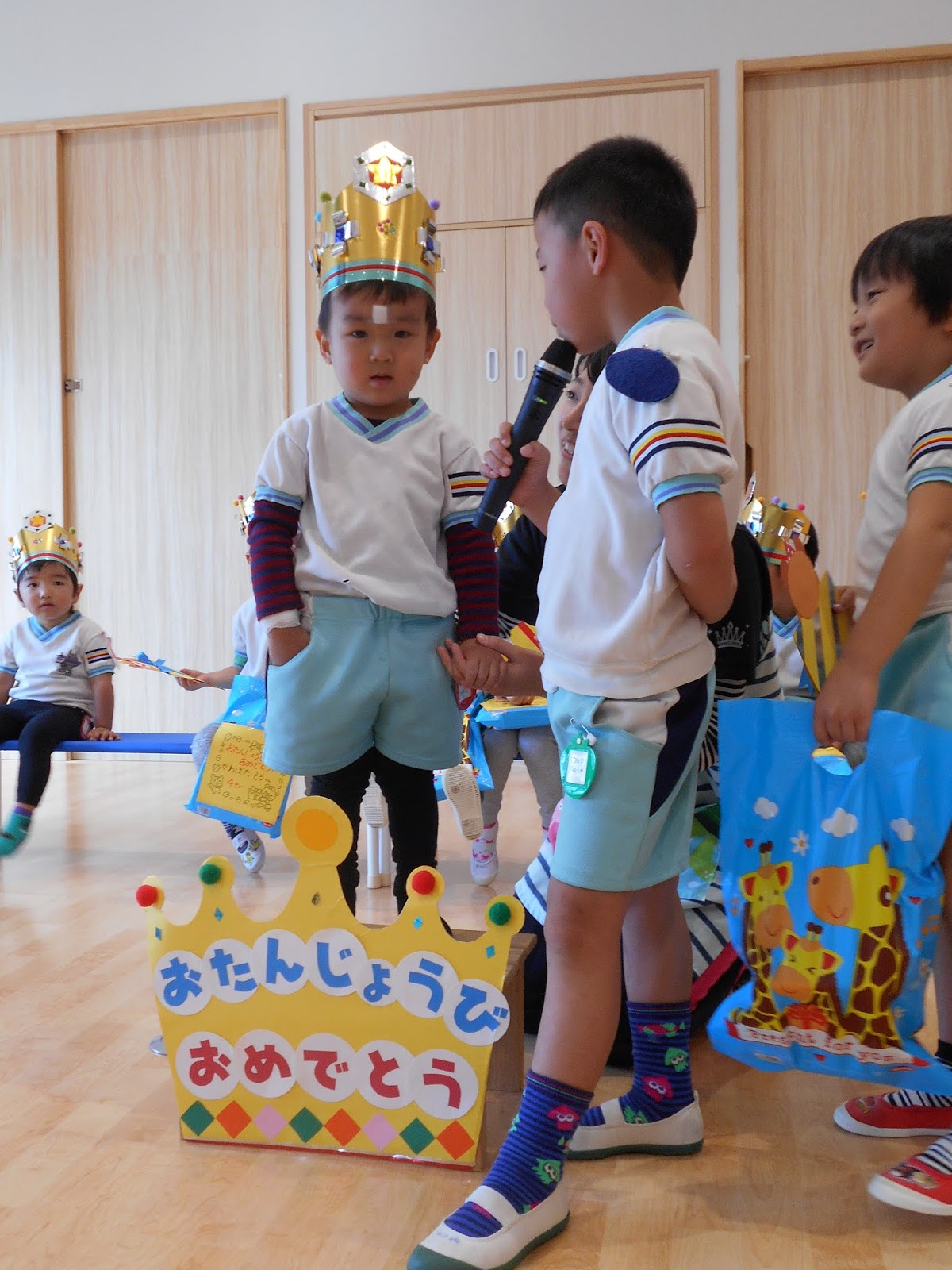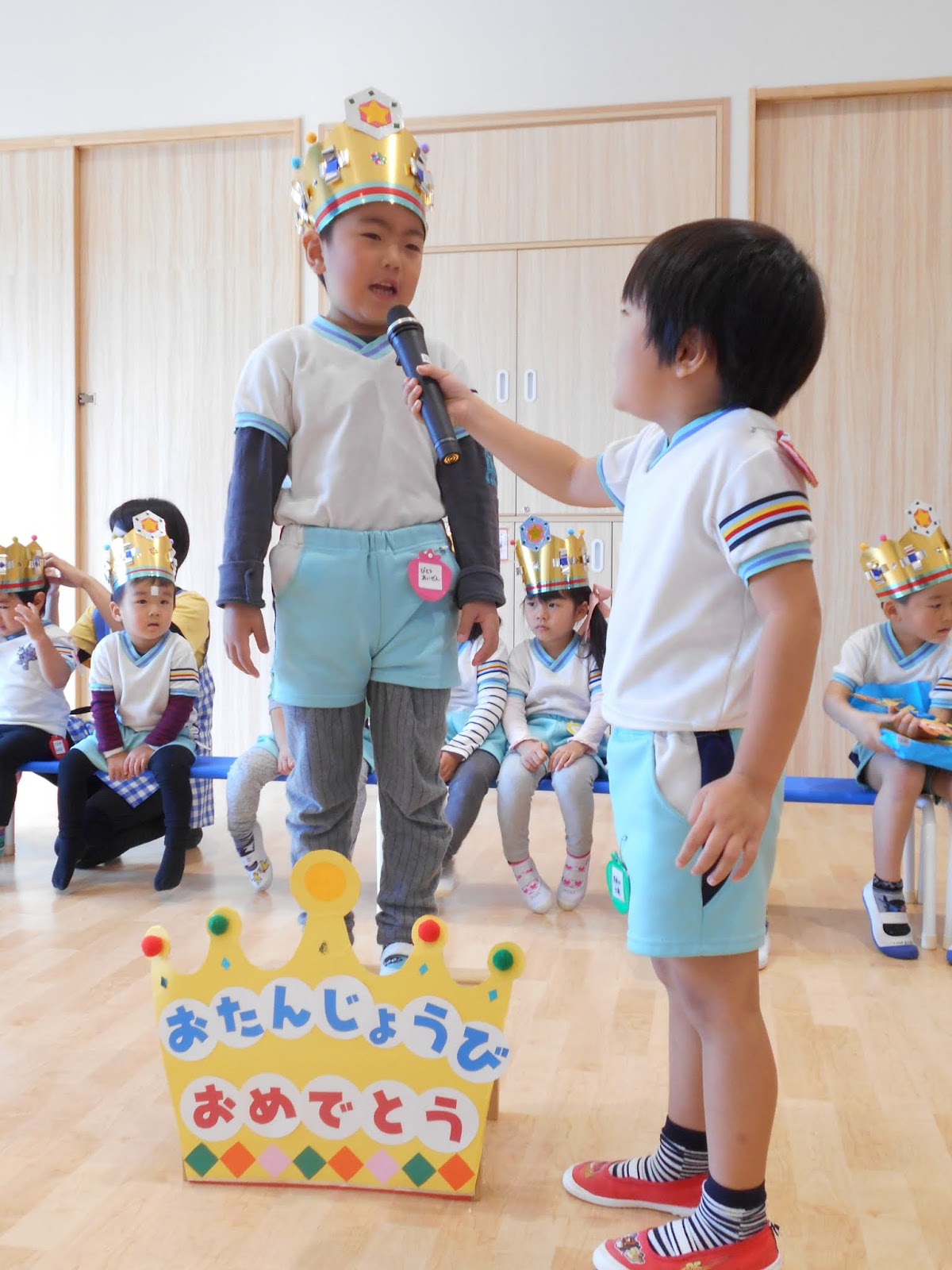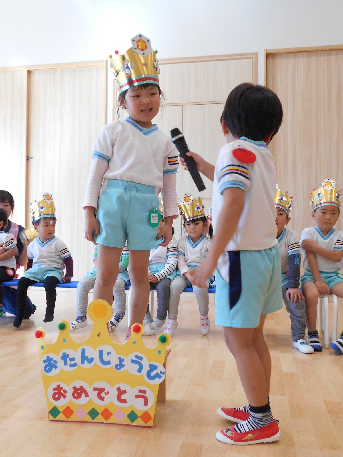 お休みの子が1人いましたが、たくさんのお友達がまた1つ大きくなりました!ひまわり組のお当番さんにインタビューされて、お名前と、年齢を教えてくれましたよ!