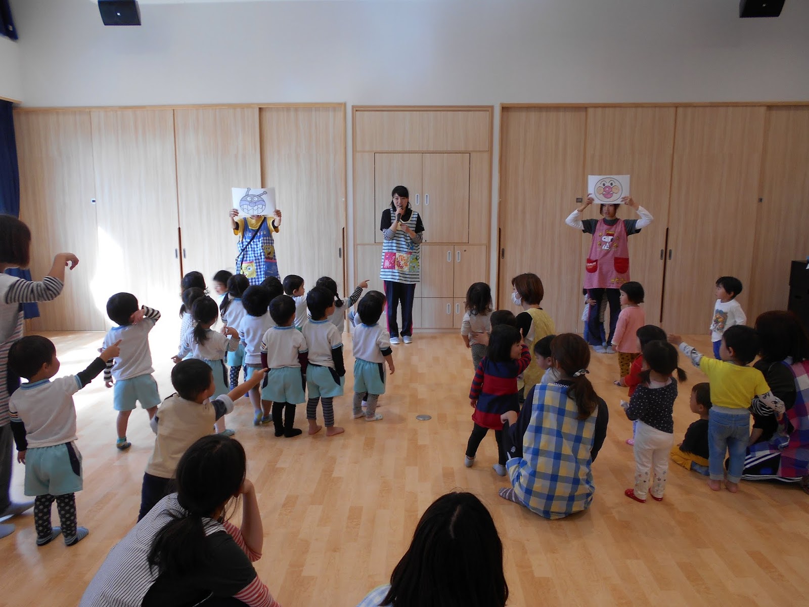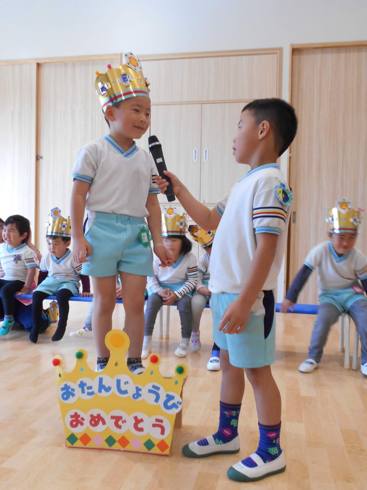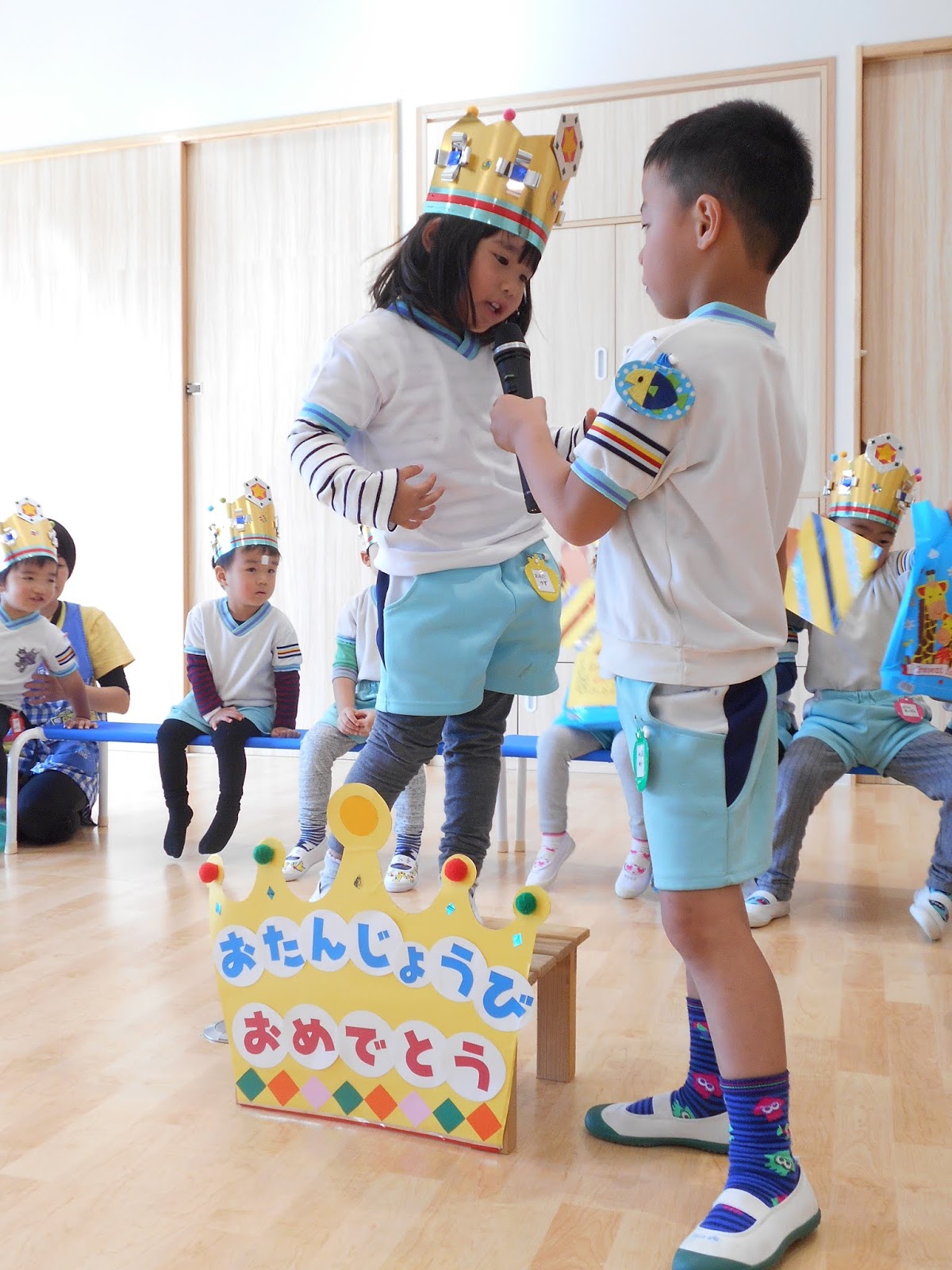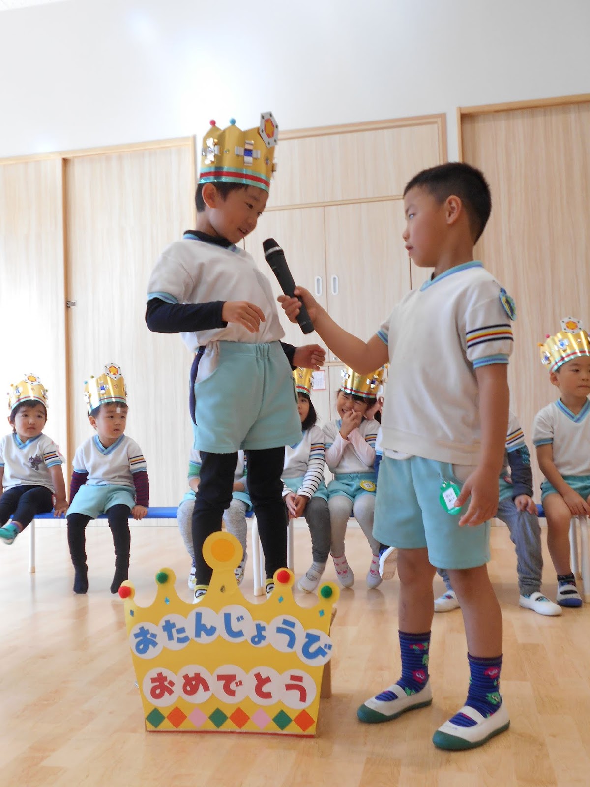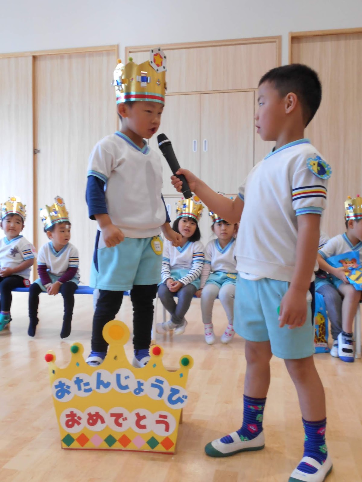 お休みの子が1人いましたが、たくさんのお友達がまた1つ大きくなりました!ひまわり組のお当番さんにインタビューされて、お名前と、年齢を教えてくれましたよ!