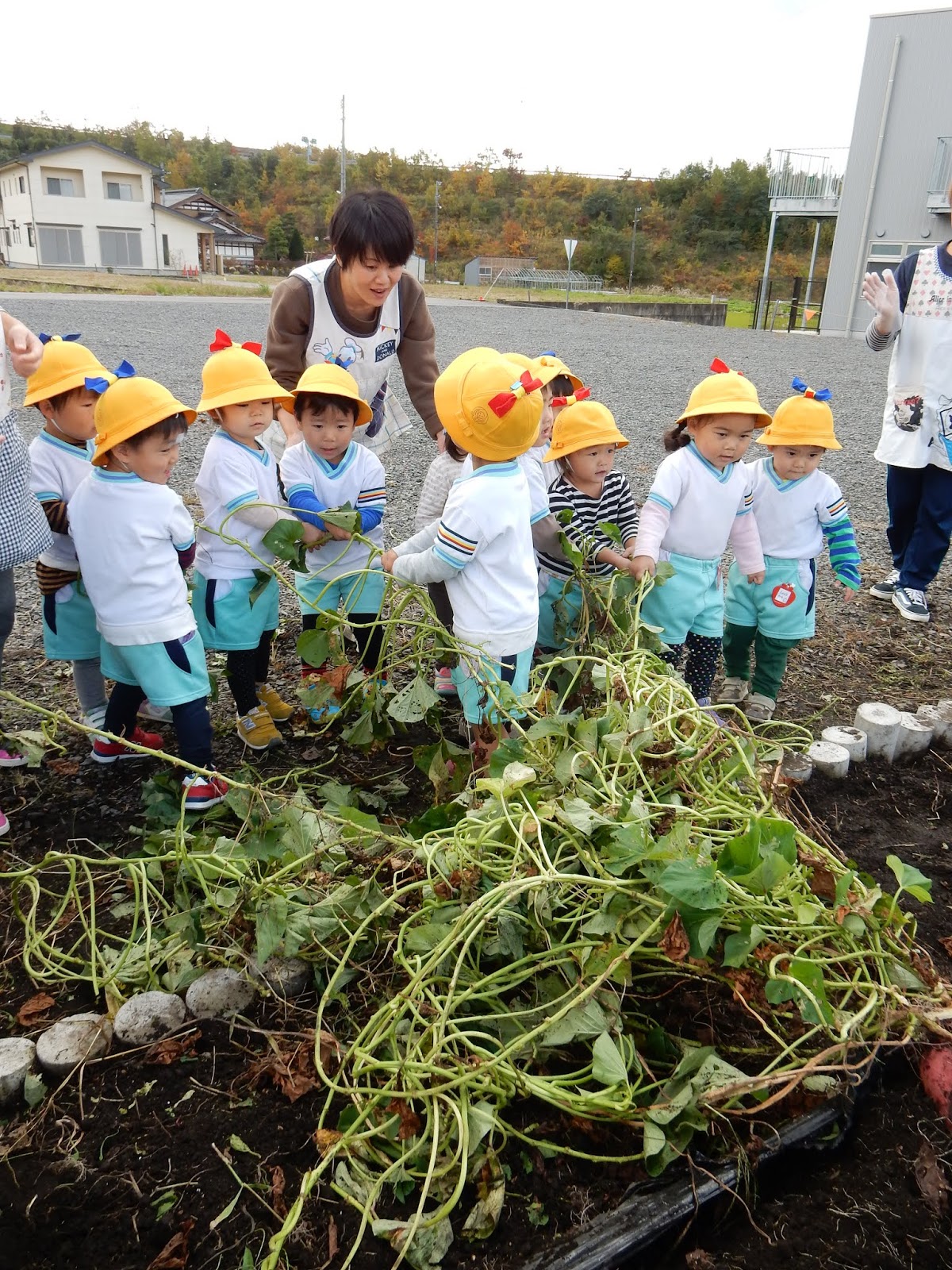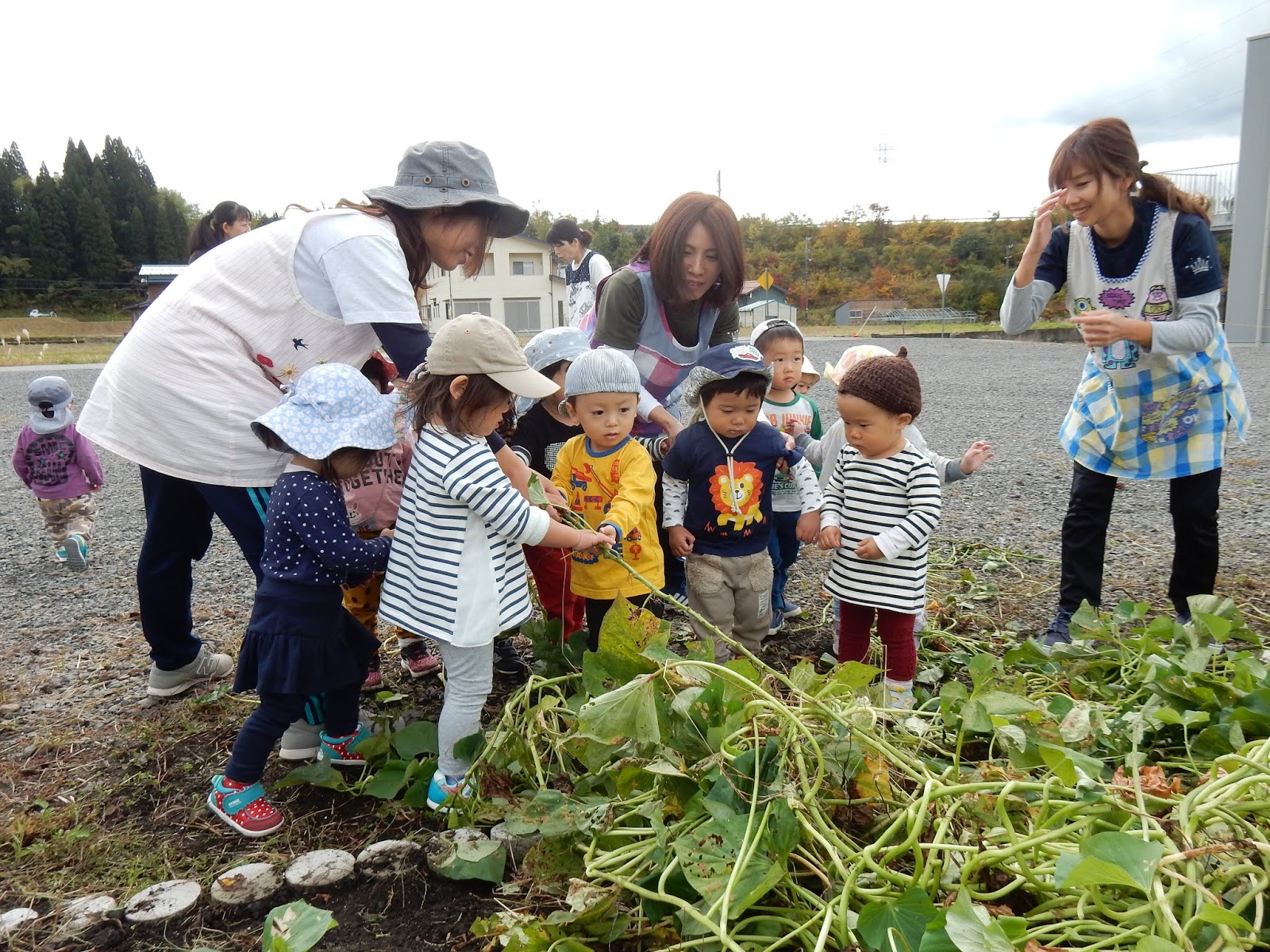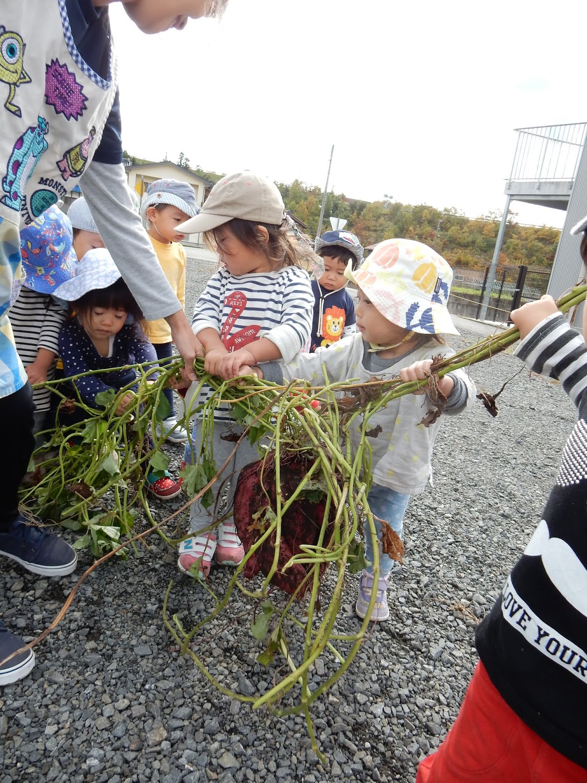 楽しくて、そして大豊作の嬉しさから、当初見学のみの予定だったたんぽぽさん、すみれさん、ひよこさんもウズウズ…子ども達の、『やりた~い!!!』という雰囲気に、少しお手伝いをお願いしました。そのため、服が土で汚れているお子さんがみえるかもしれません!すみません!