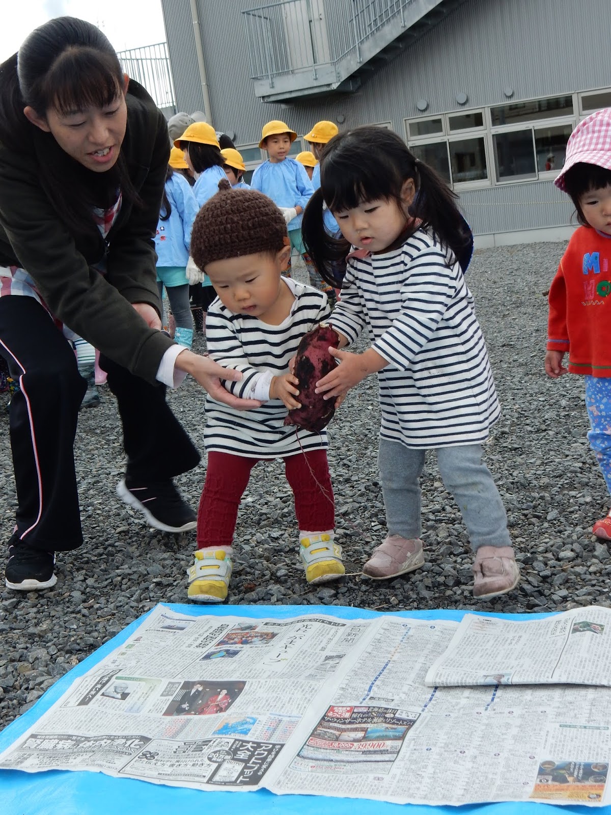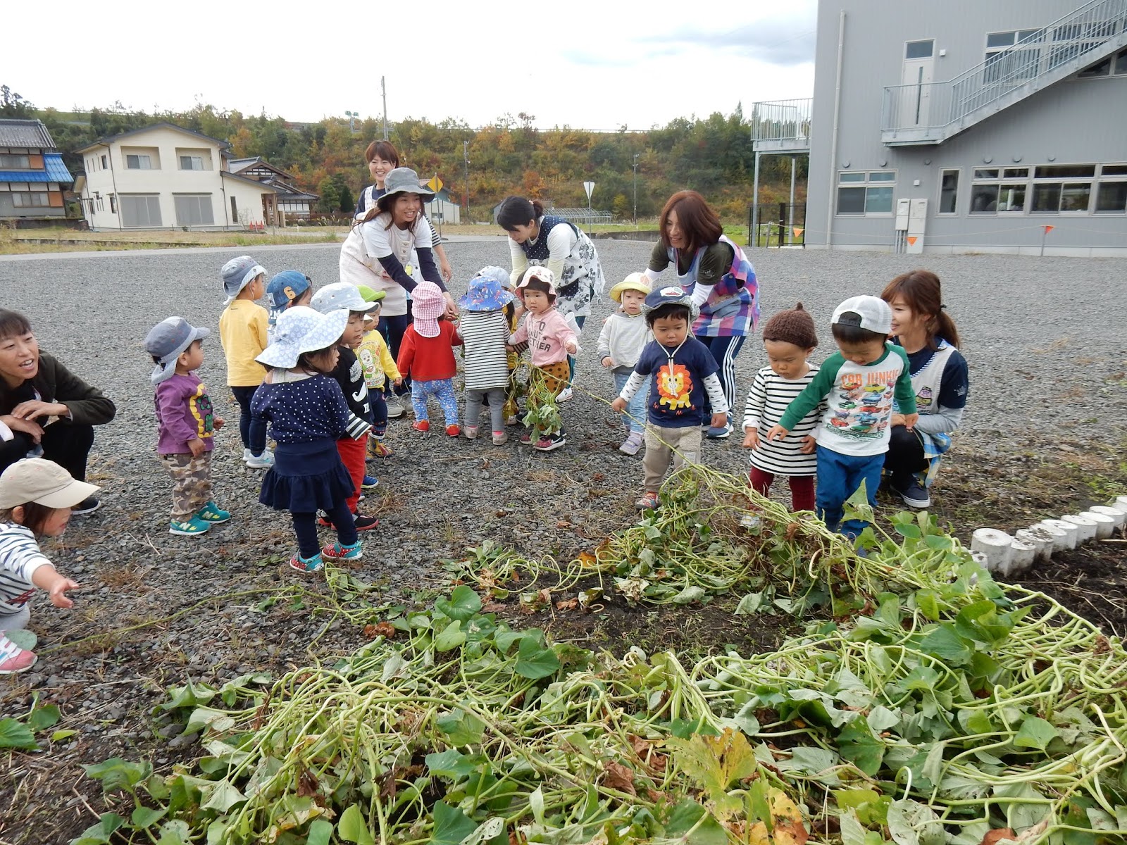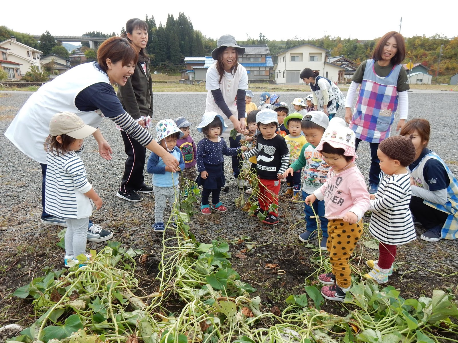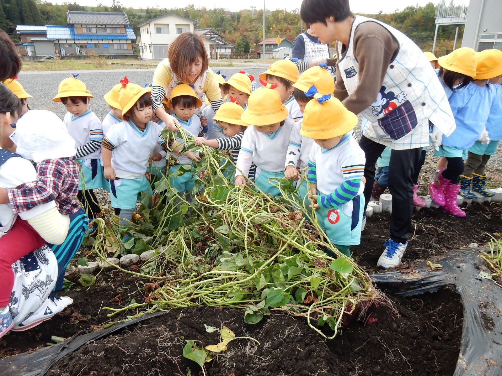楽しくて、そして大豊作の嬉しさから、当初見学のみの予定だったたんぽぽさん、すみれさん、ひよこさんもウズウズ…子ども達の、『やりた~い!!!』という雰囲気に、少しお手伝いをお願いしました。そのため、服が土で汚れているお子さんがみえるかもしれません!すみません!