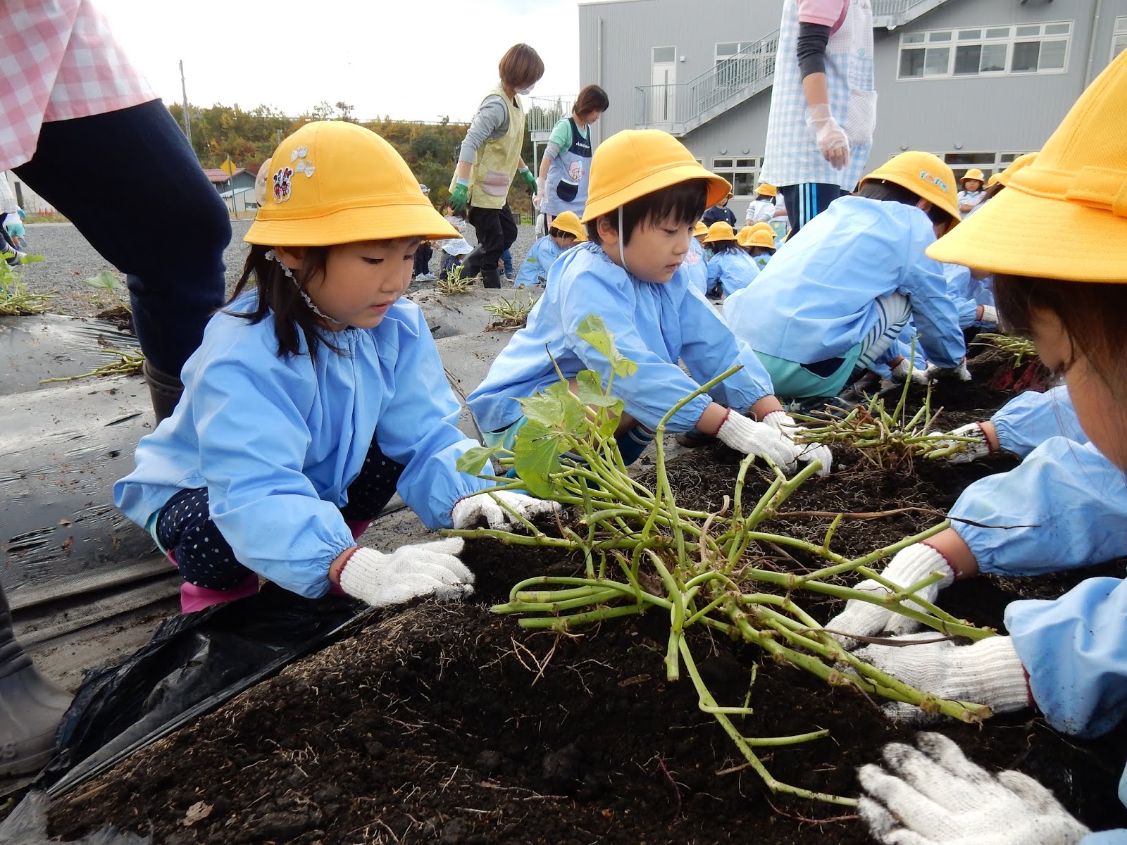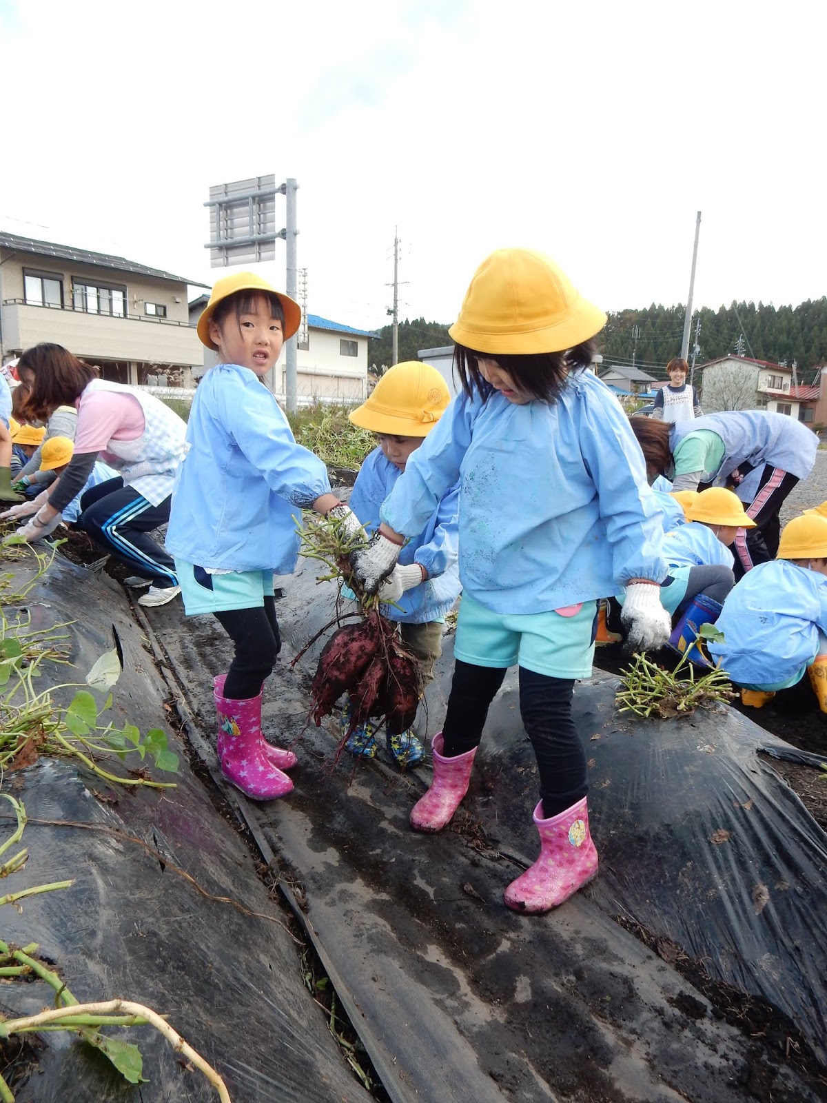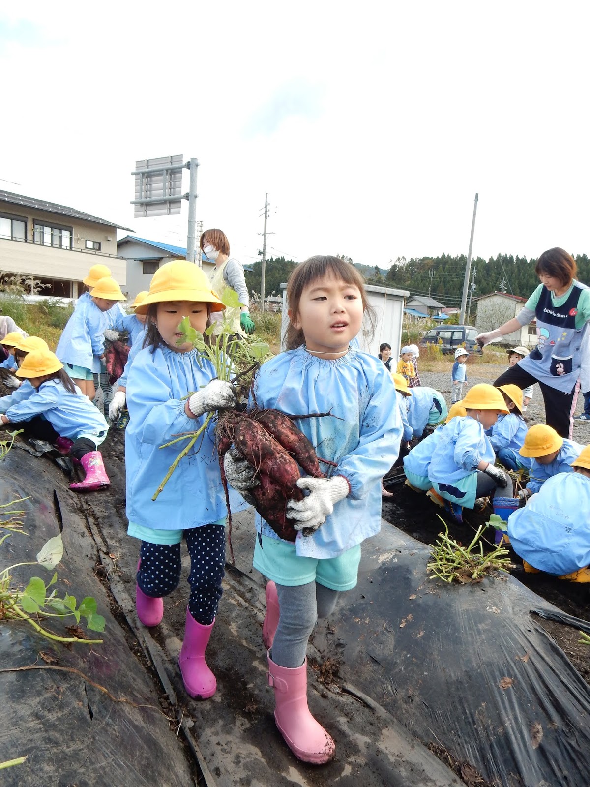 そして、長靴に、軍手、スモッグを着て臨んだゆりさんと、ひまわりさんも、予想外に大量のお芋に、張り切ってお仕事をしてくれる子が多く、長靴の中まで土が入り込み、靴下が真っ黒…なぁんていう事態に!こちらもすみません!そして、持ち帰った長靴は、一度中を確認してあげて下さい!