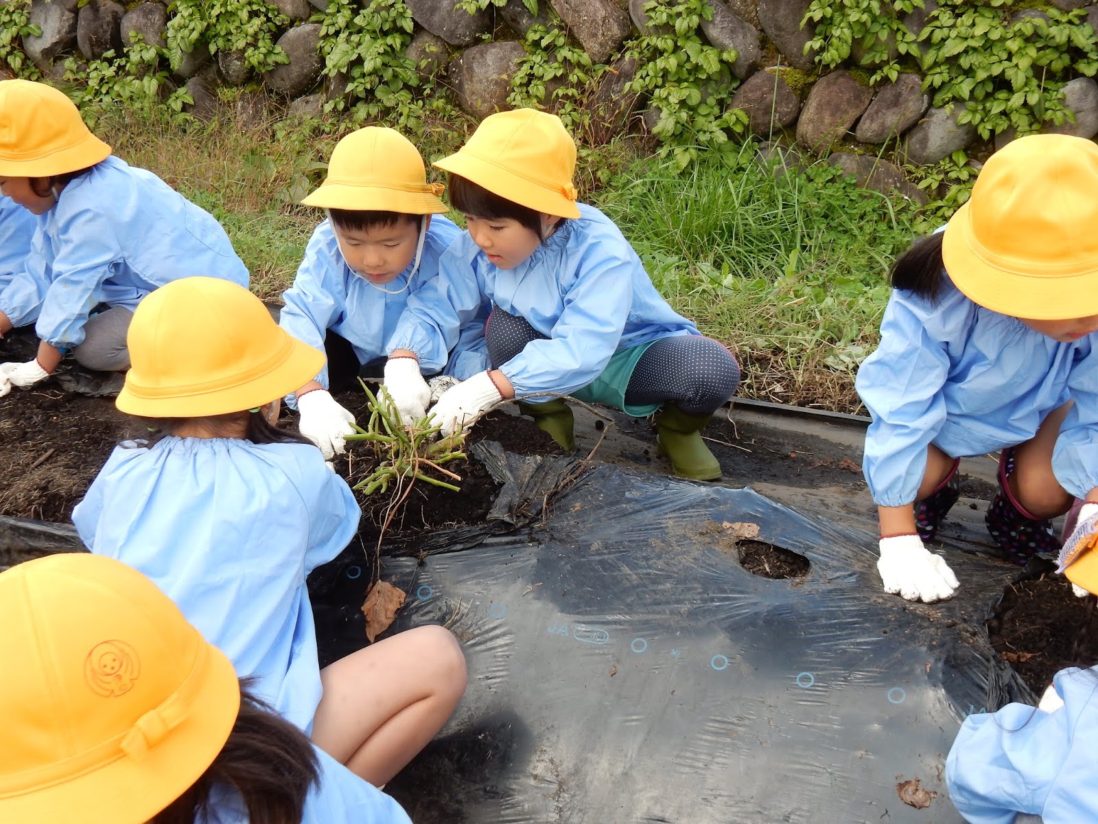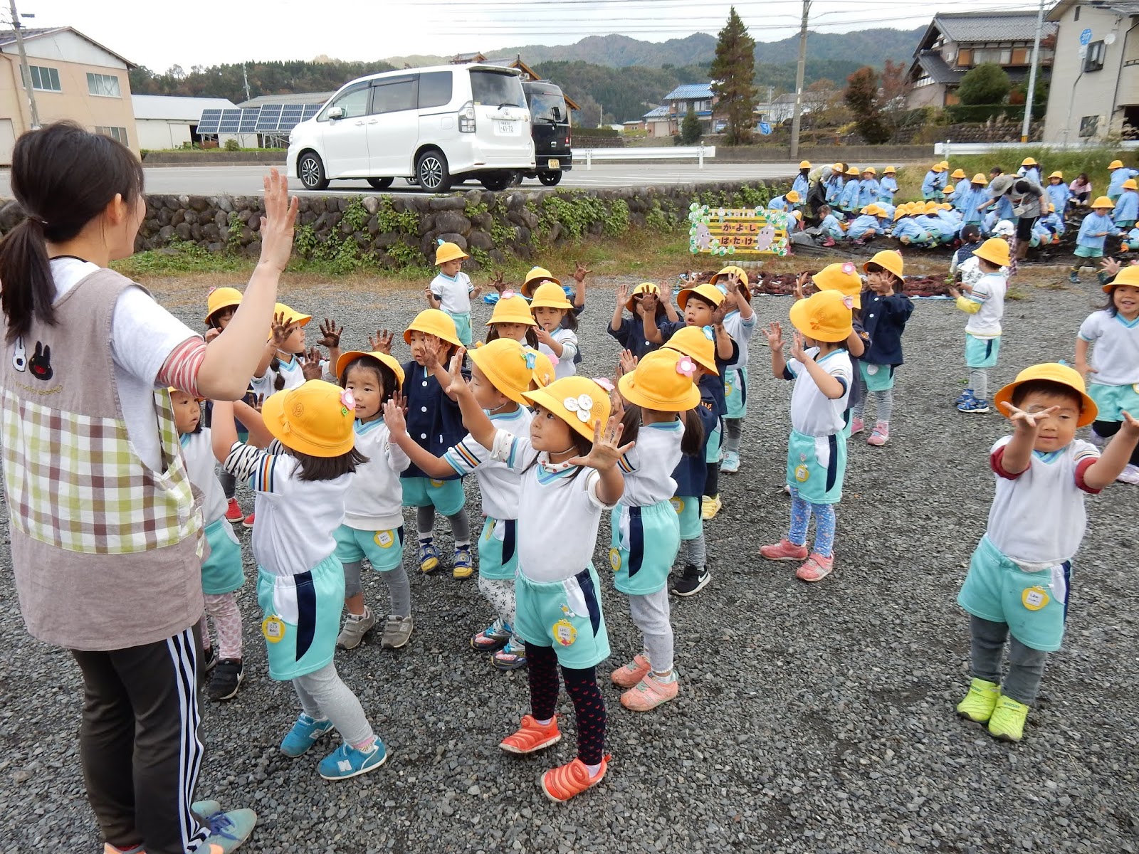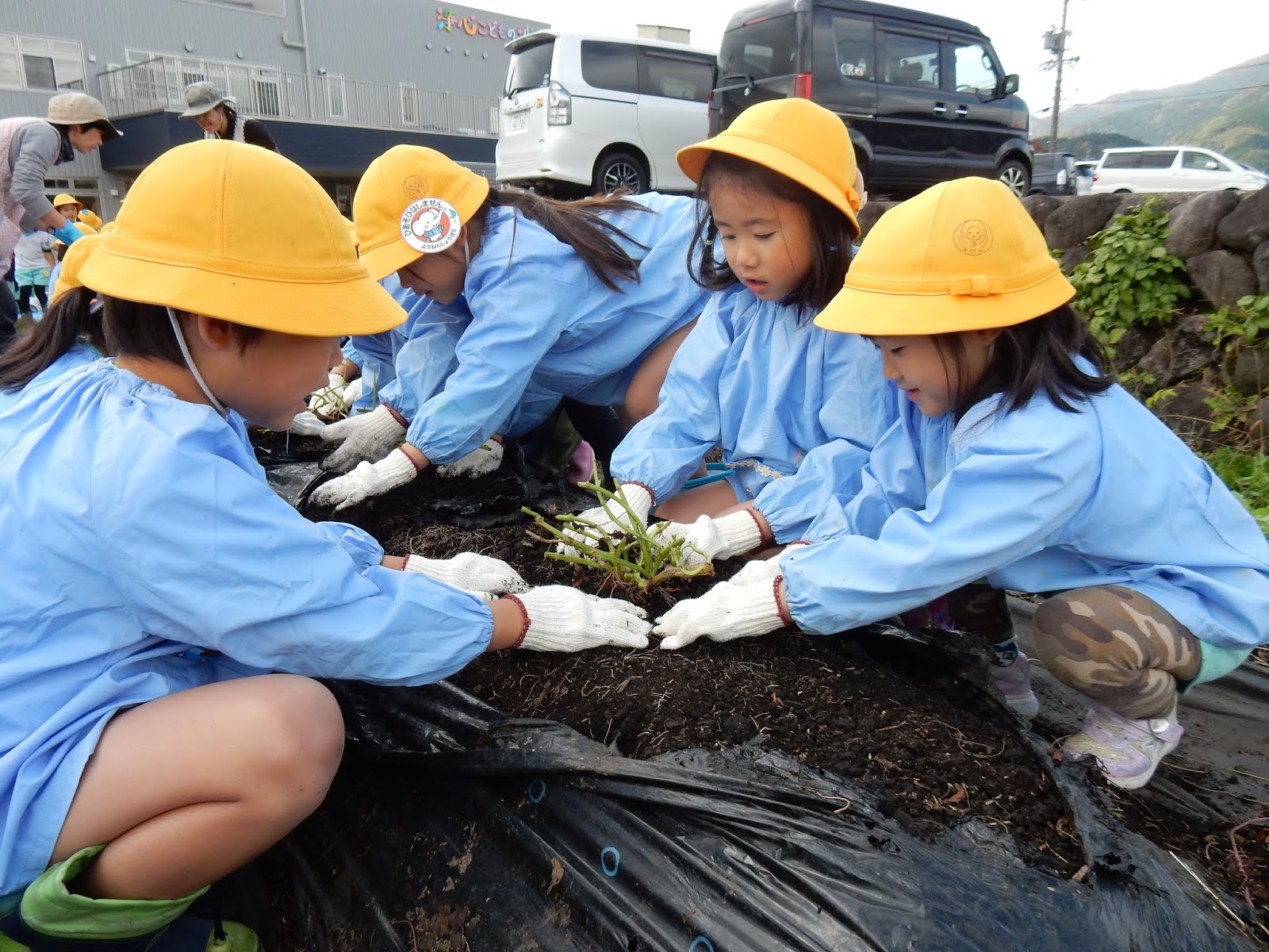 みんな手が真っ黒!体操服をできるだけ汚さないように…と、みんなこの姿勢のまま水道まで歩いて行く姿が可愛らしかったです!