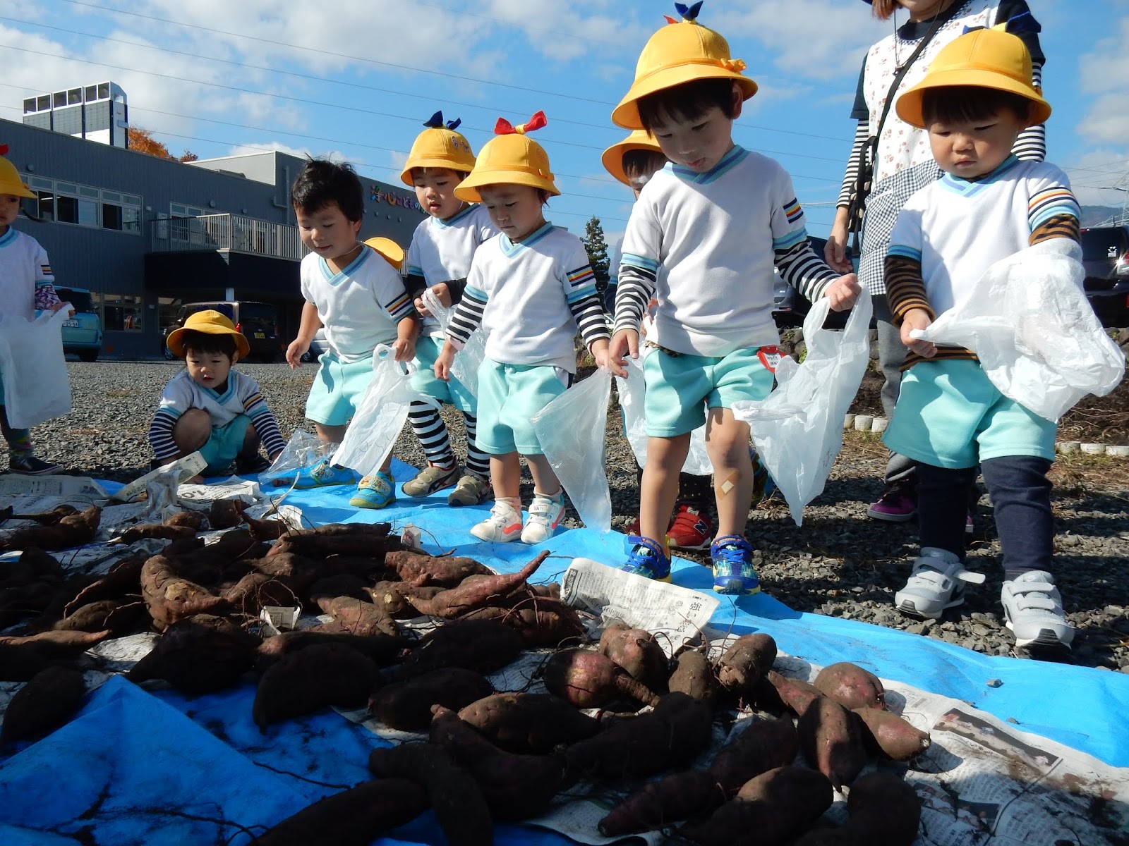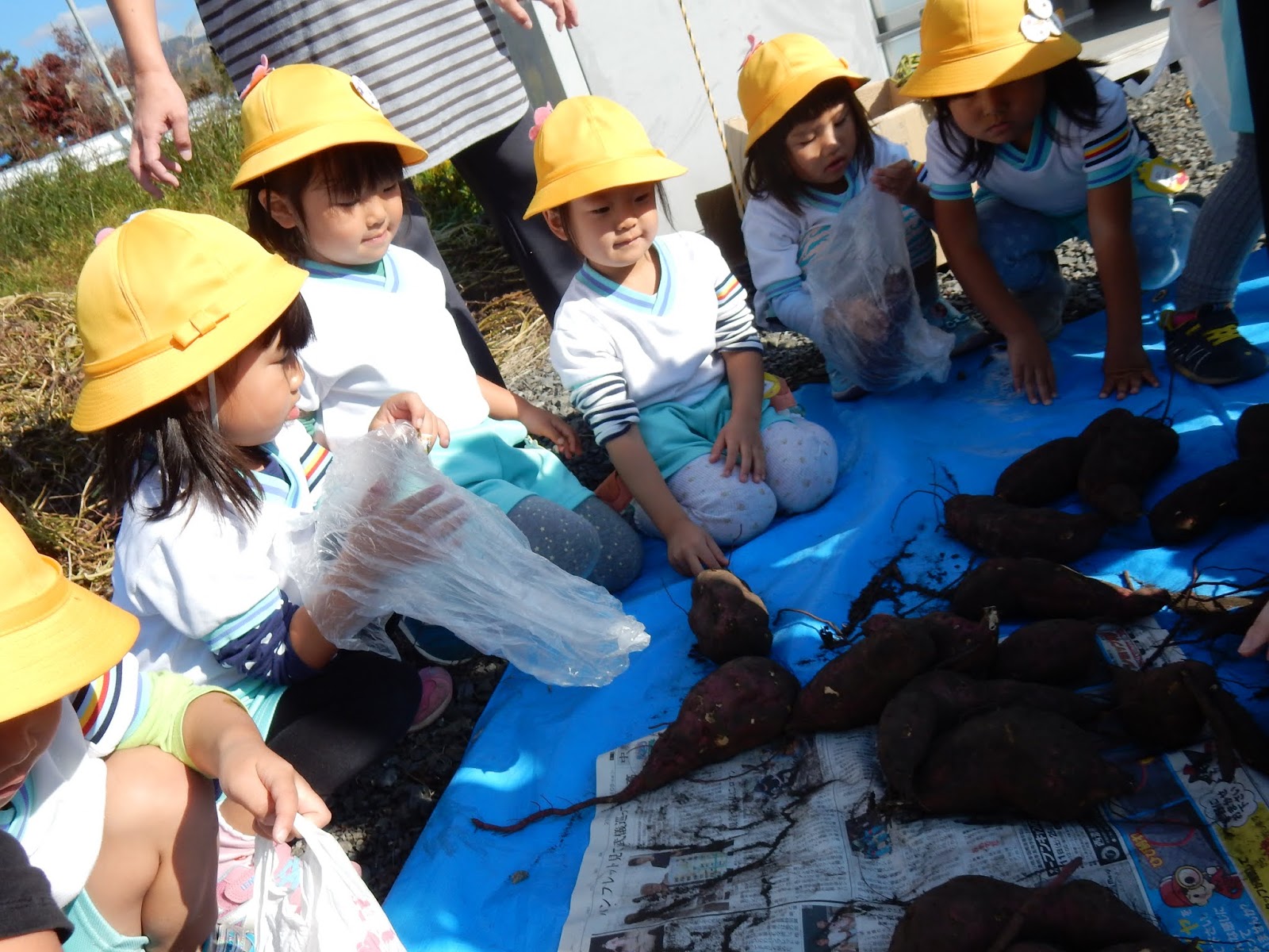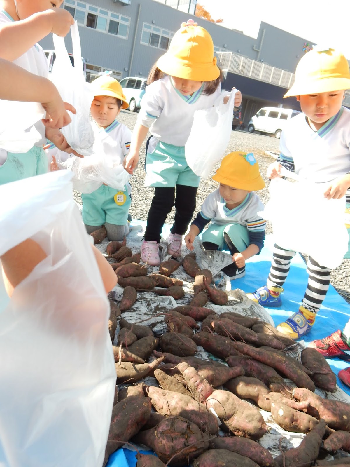 1本選んだら、持ってきたビニール袋に大事に片付けます。『重たい~!!!!』と選んだお芋を見せてくれたみんな。なかには、いつのまにか、4本袋に入れているお友達も!先生に見つかり(笑)しぶしぶ1番大きい物を残して元の位置へ戻してくれました。