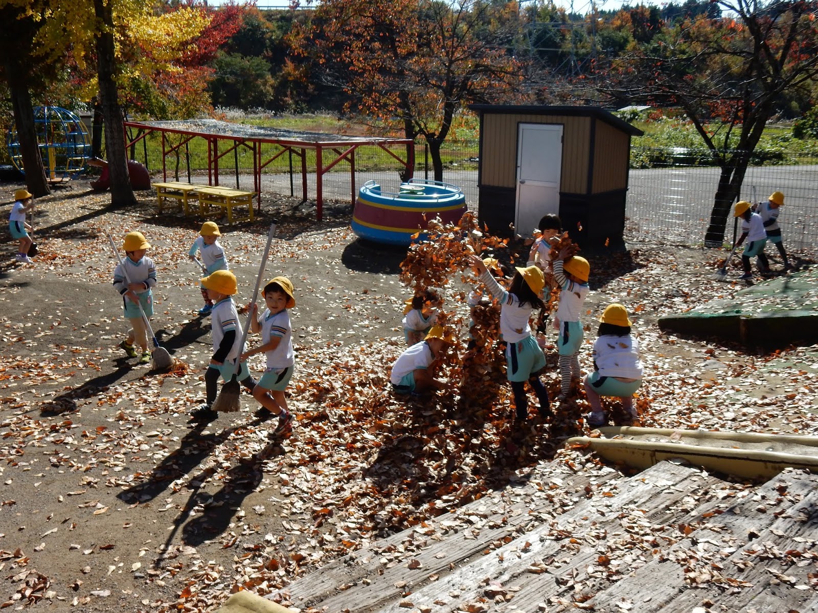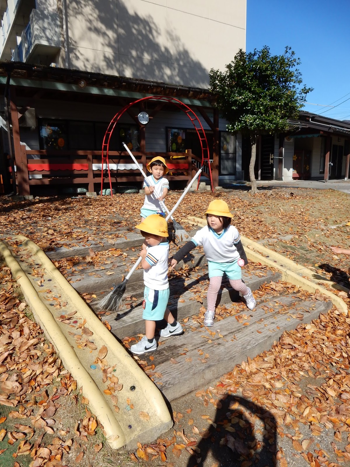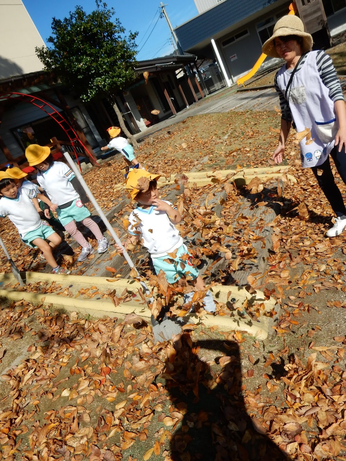 園庭の落ち葉を毎朝お掃除していますが、たくさん落ちた葉っぱをそのままにしておくと…