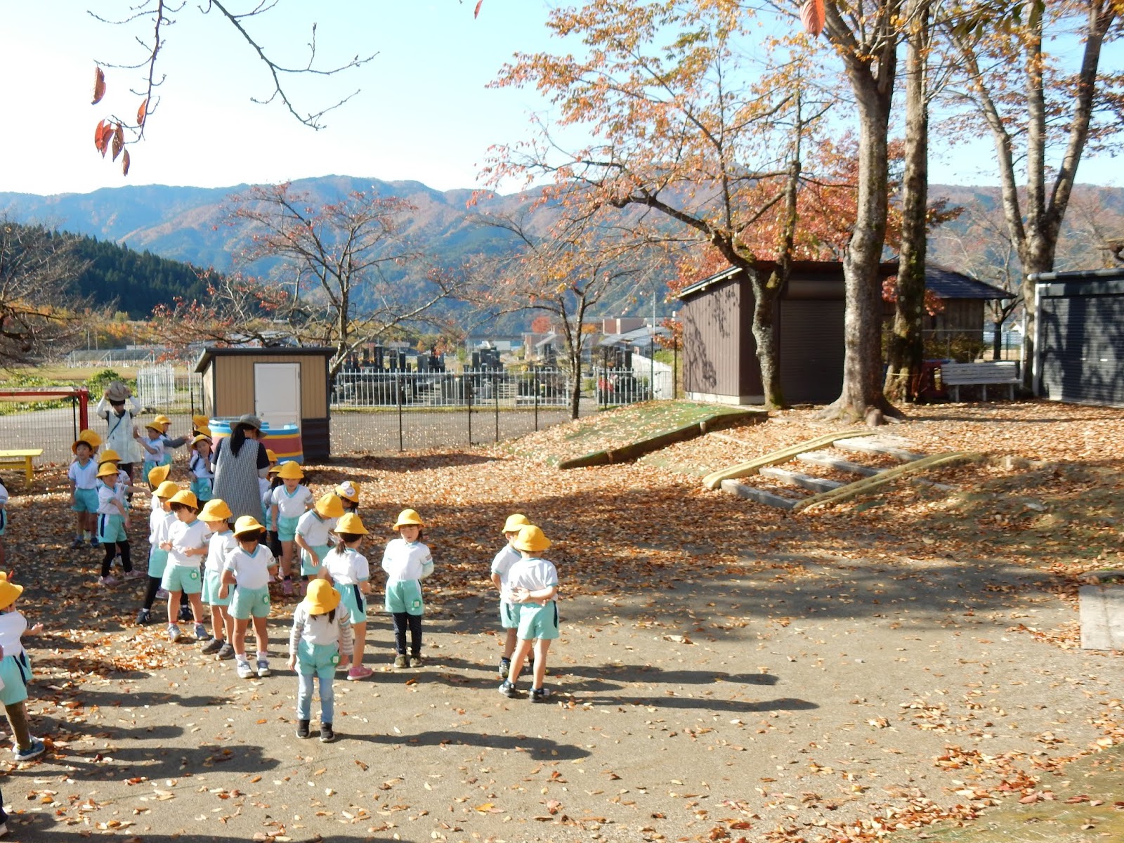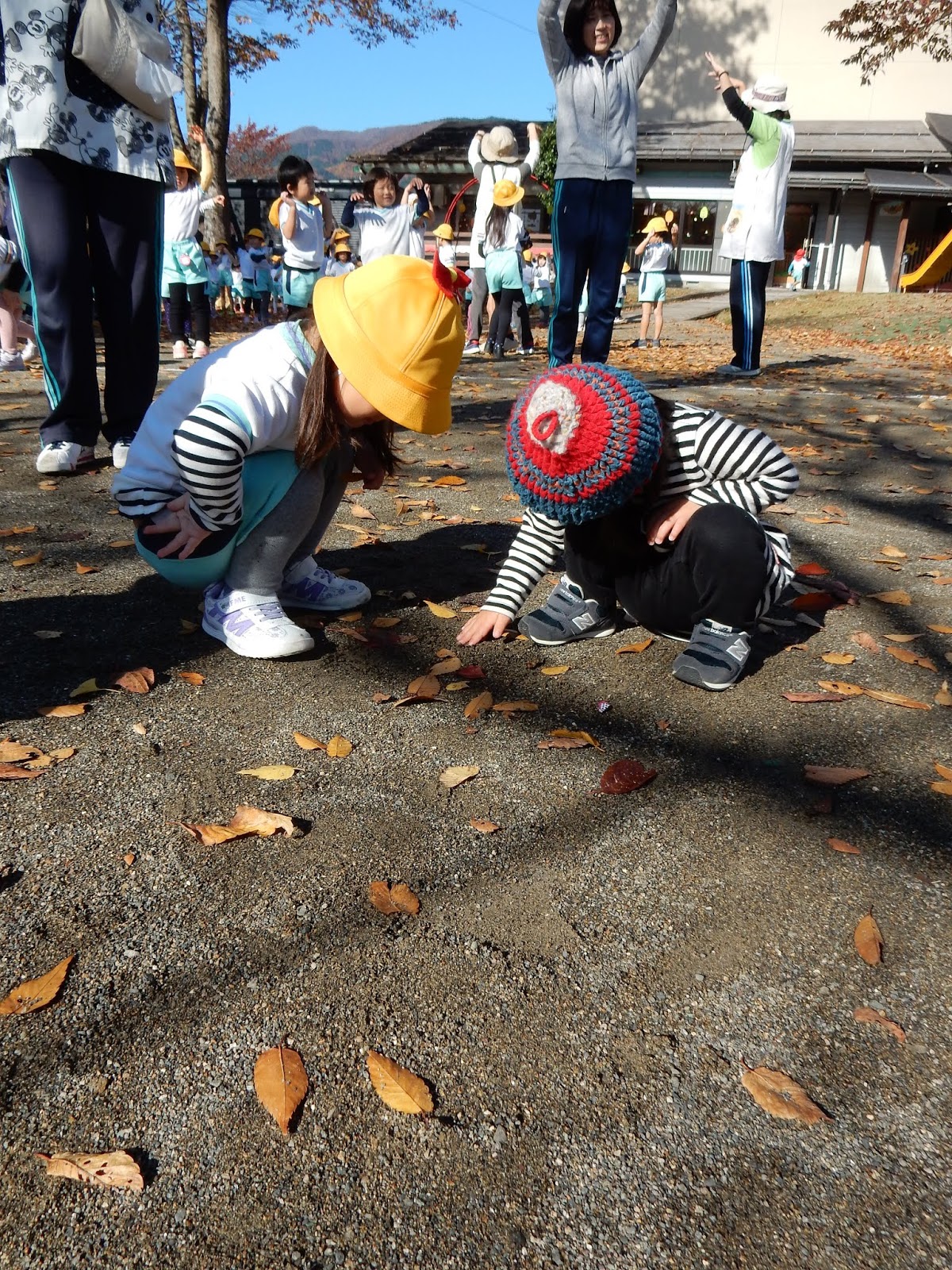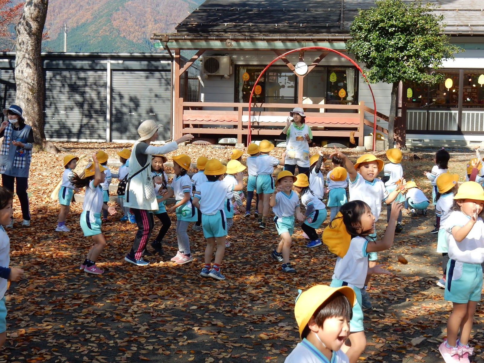 園庭の落ち葉を毎朝お掃除していますが、たくさん落ちた葉っぱをそのままにしておくと…