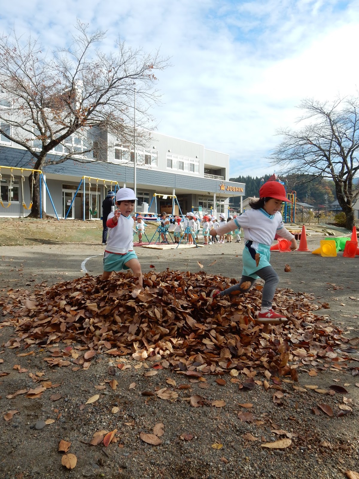 たくさん集まった落ち葉の上を、みんなが思い切り走って通り抜けます!ダイナミックなお友達は、ゴロリと転がってみたり、すくった葉っぱを放り投げたり…このコーナーができるのも、いまの時期だけですよね!