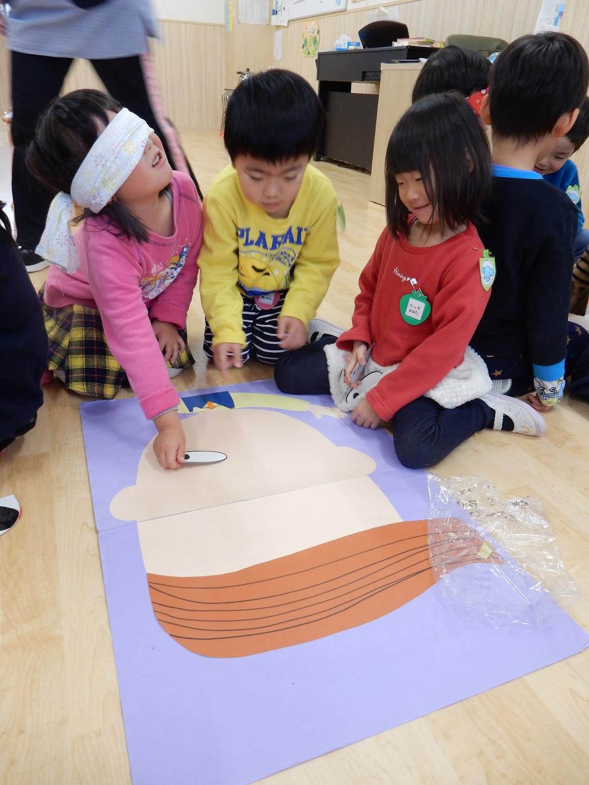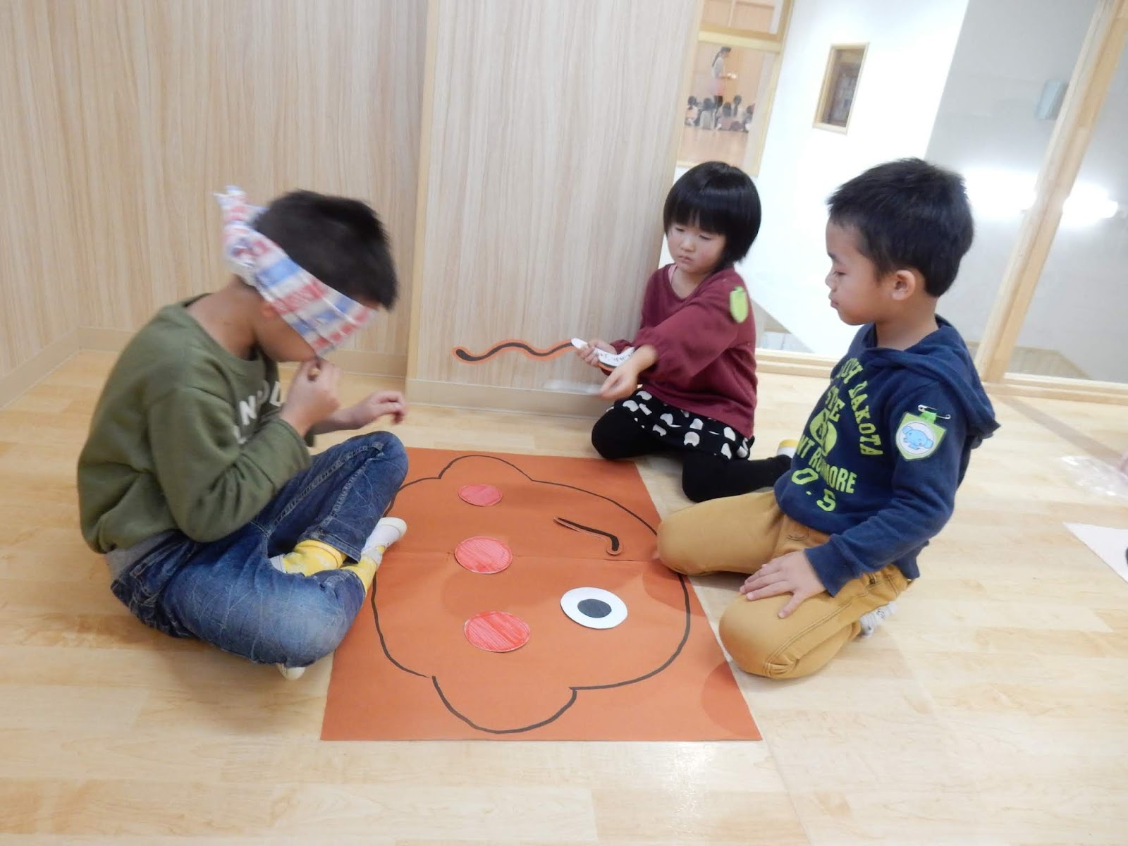 大きいお友達は、てぬぐいで目隠しをして挑戦しました!なかなか難しいと思いますが、ちかくでお友達が『もう少し上だよ!』 『次は口ね!』と教えてくれるので、その声を頼りに並べていきます。面白い顔になったり、目隠しをとると大盛り上がり!