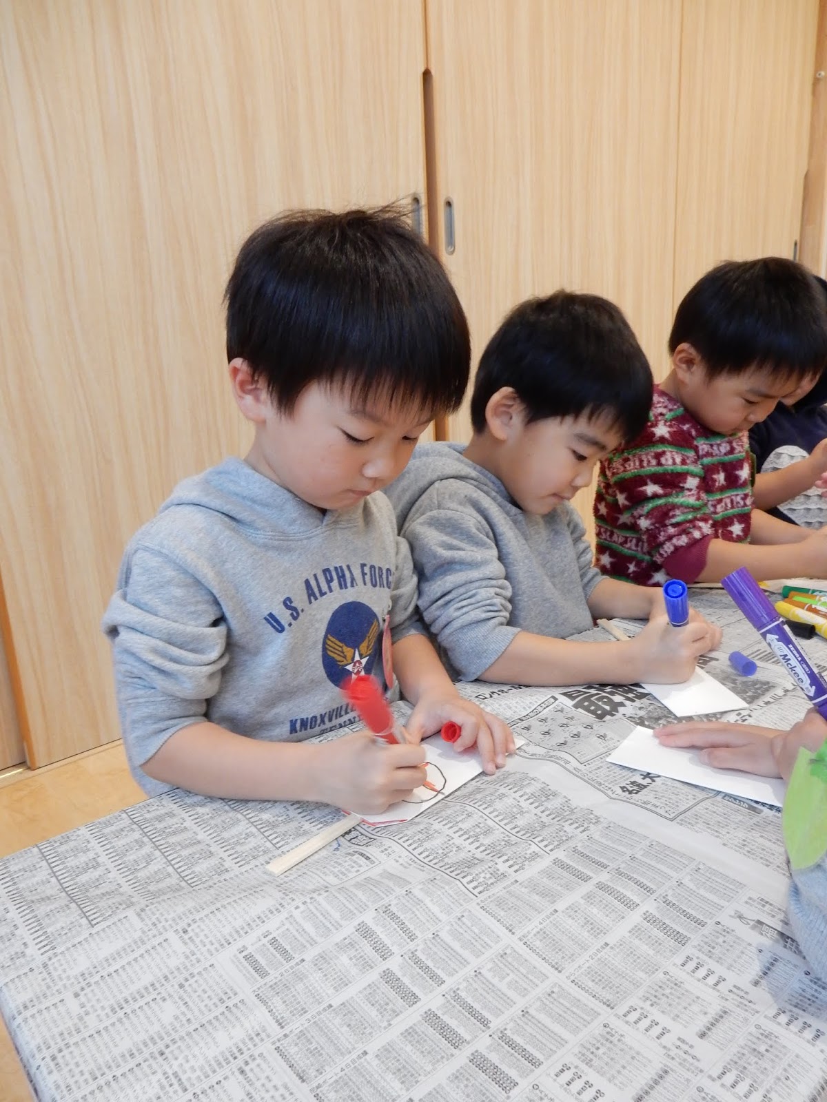 他にも、お正月あそびと言われる伝承遊びは、すごろくや、コマ回し、凧揚げと色々ありますね。12月にこのテーマを選んでいるのは、年末年始のお休みに向けて、子ども達にこういった遊びに興味を持ってもらい、是非ご家庭であそんでほしいからです。数字やひらがなへの関心につながったり、テレビゲームから離れて、昔ならではの遊びを通して友達や家族との会話をたのしんでほしいなぁと願っています♪