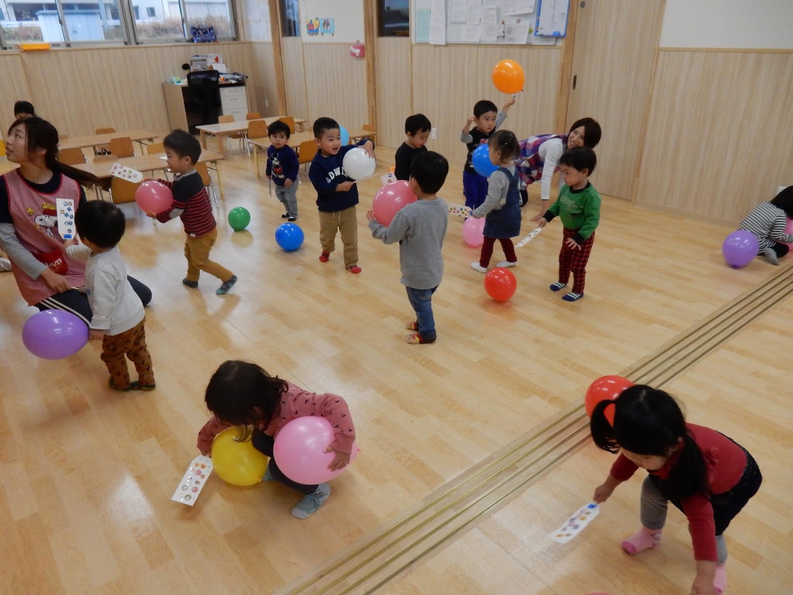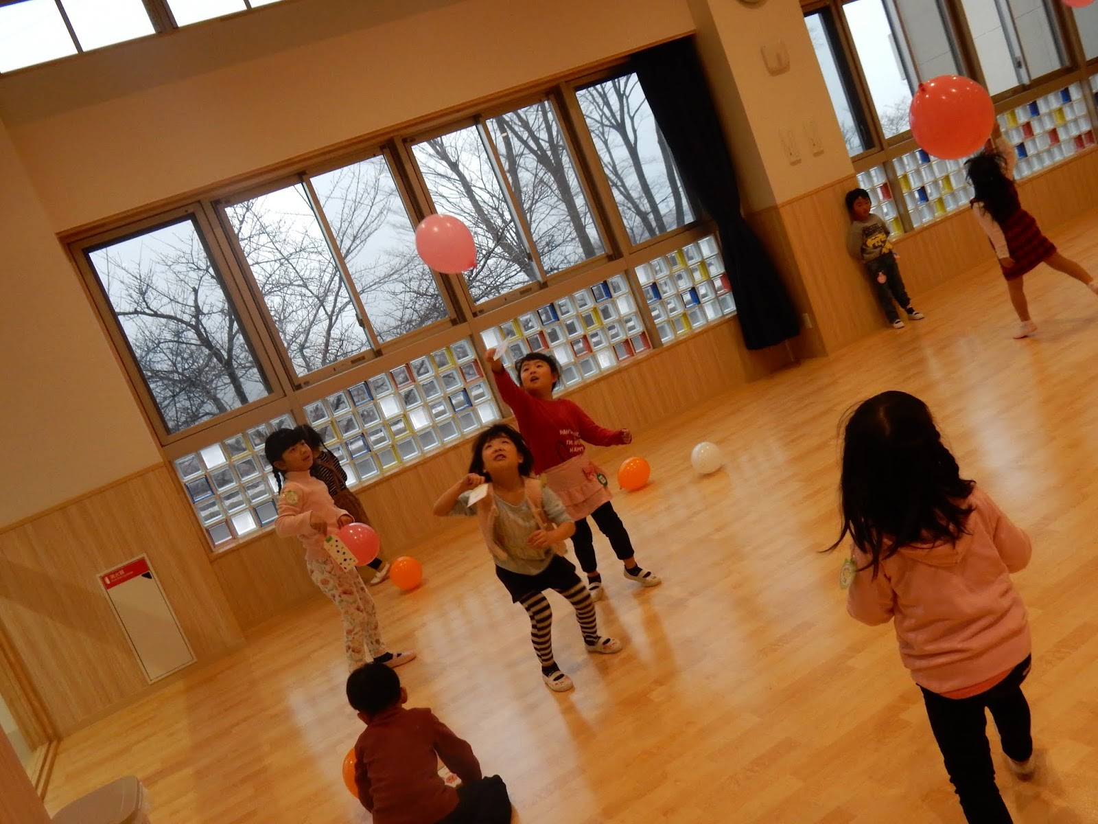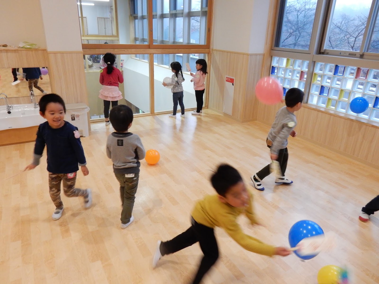 今日は、羽ではなく、風船を使いました。作った羽子板を持って、風船をつきます。1人で数を数えながらやったり、何人かで協力したり。先生と対決してみたりと、遊び方は色々ですが、みんな基本上向き(笑)ポカンと口が開いちゃってる子もいましたが、それだけ真剣という事ですね!