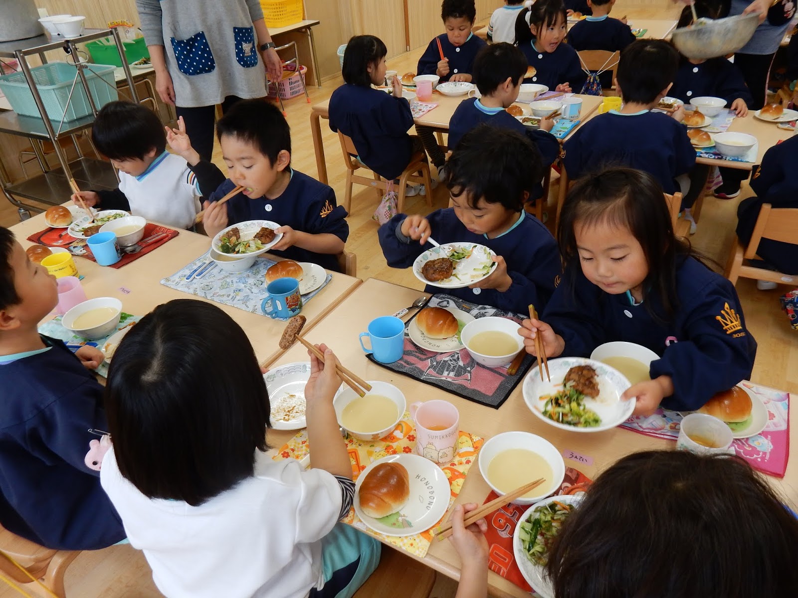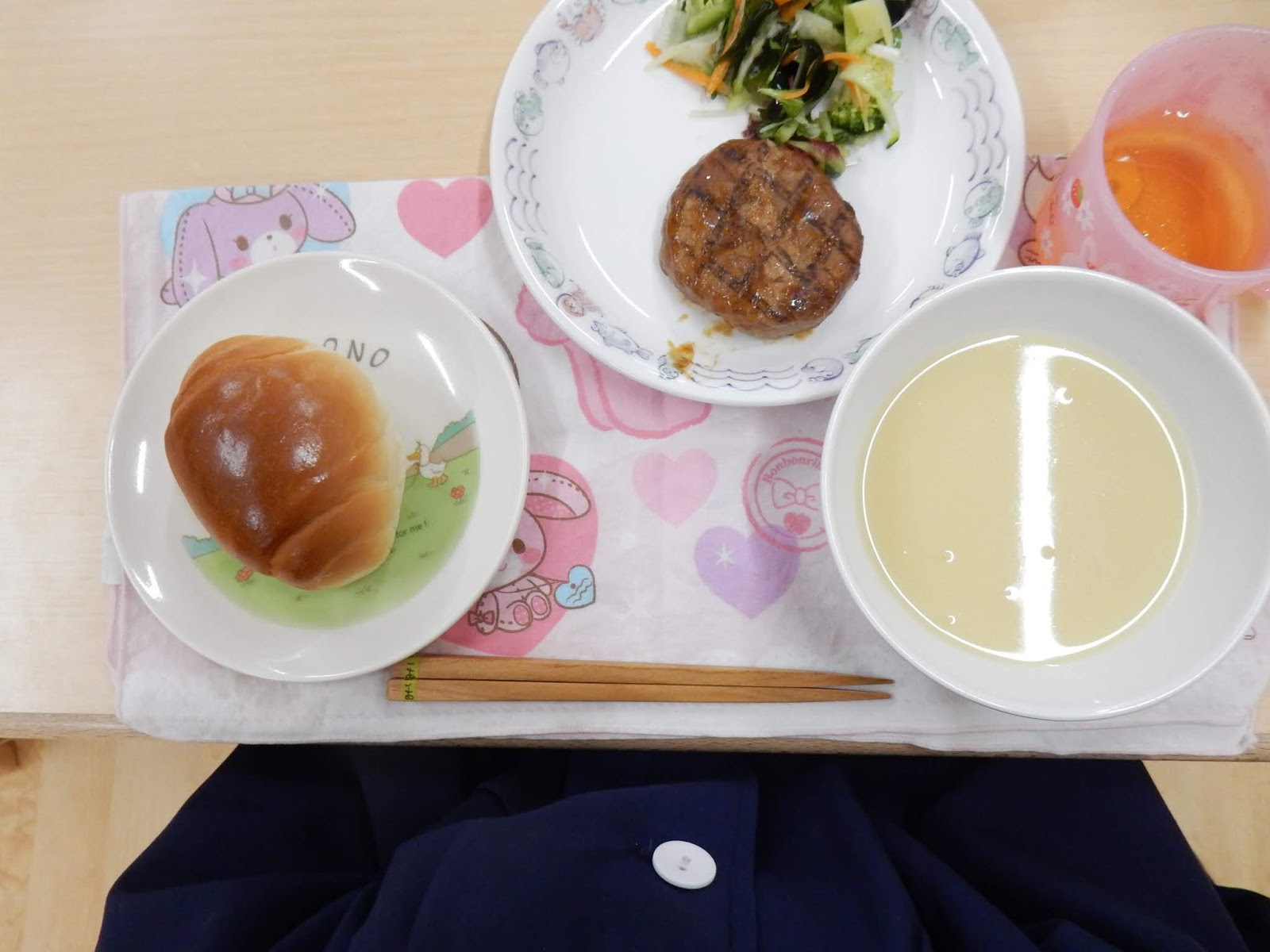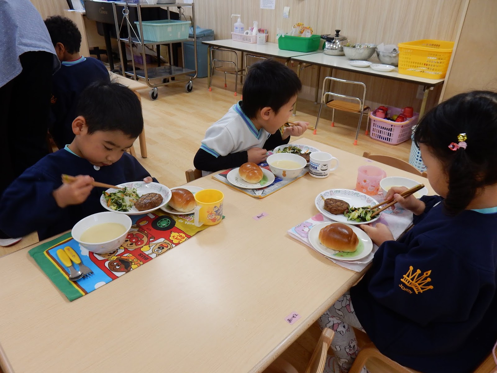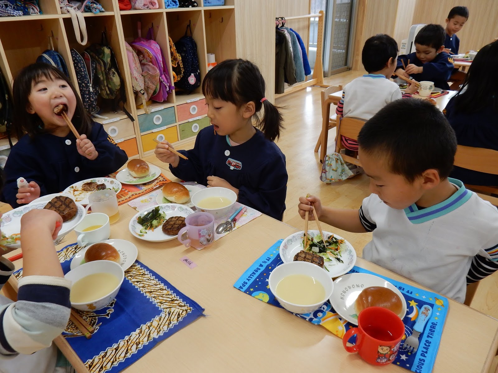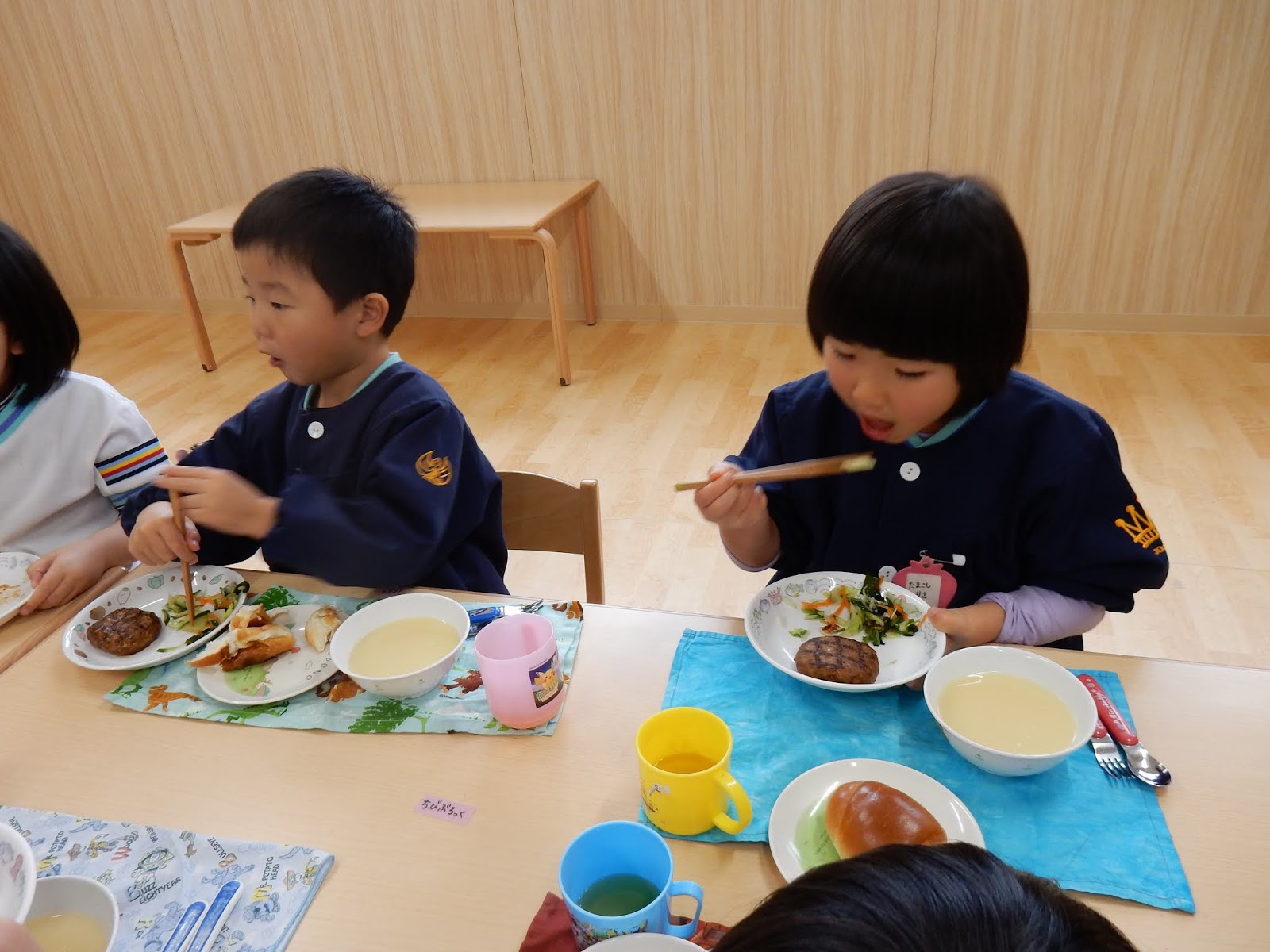 待ちに待っていた子ども達、配膳の間も、なんだかいつも以上に姿勢よく、静かに待つことができた様子。いただきますのご挨拶をして、早速自分で作った箸で野菜をはさんだり、ハンバーグを切ったり。