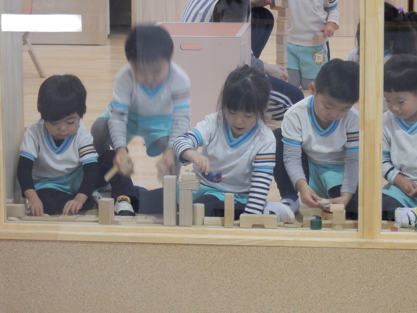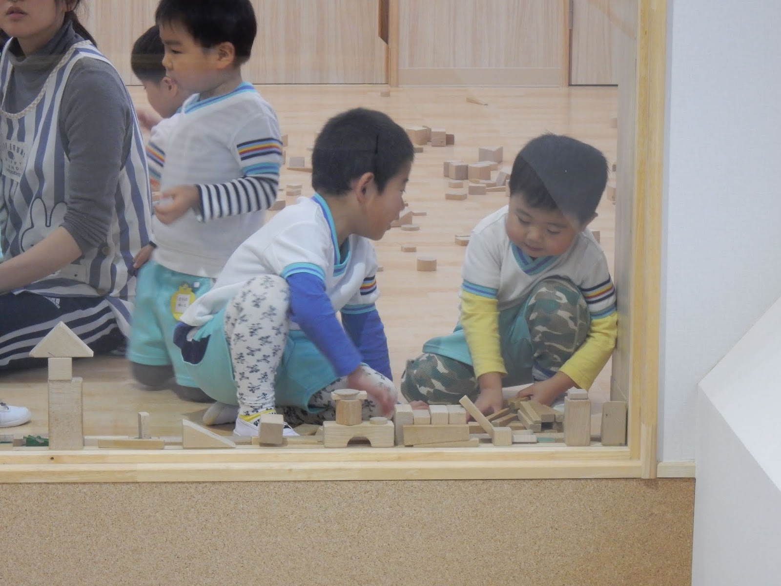 職員室からふと2階(たんぽぽの部屋)を見上げると、チラリと見えるジオラマ風の積木♫
