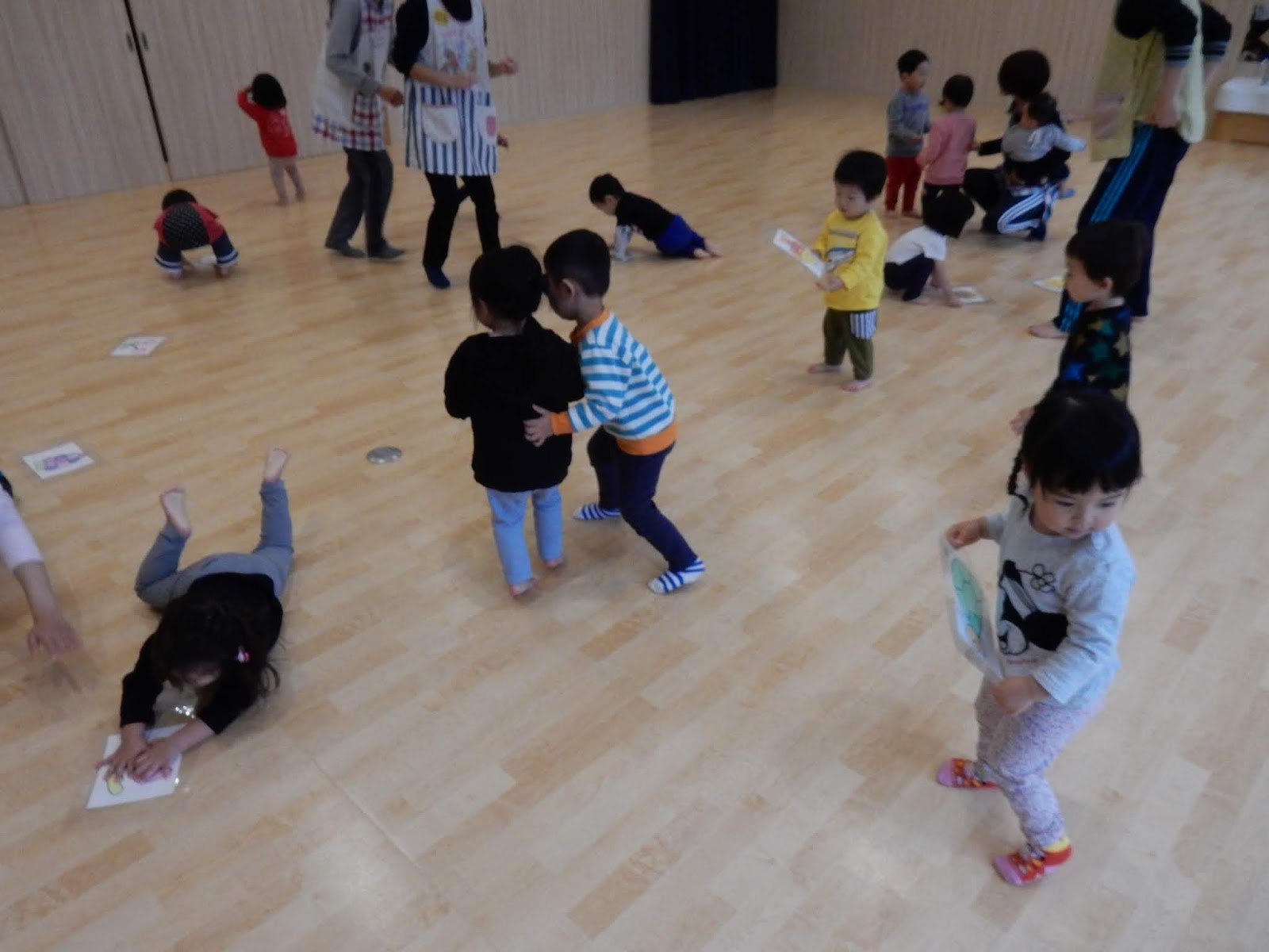 よーいどん!!!という先生の掛け声とともに走り出すひよこさん。ホールで遊んでいるみんなが目指している物は、自分のマークの付いたプレートです。靴箱や、ロッカーなどいろんな場所に目印で貼ってあるシールと同じ絵が書かれていて、自分のマークを一生懸命探しています。単純な遊びですが、思い切り体を動かして体もポカポカ!