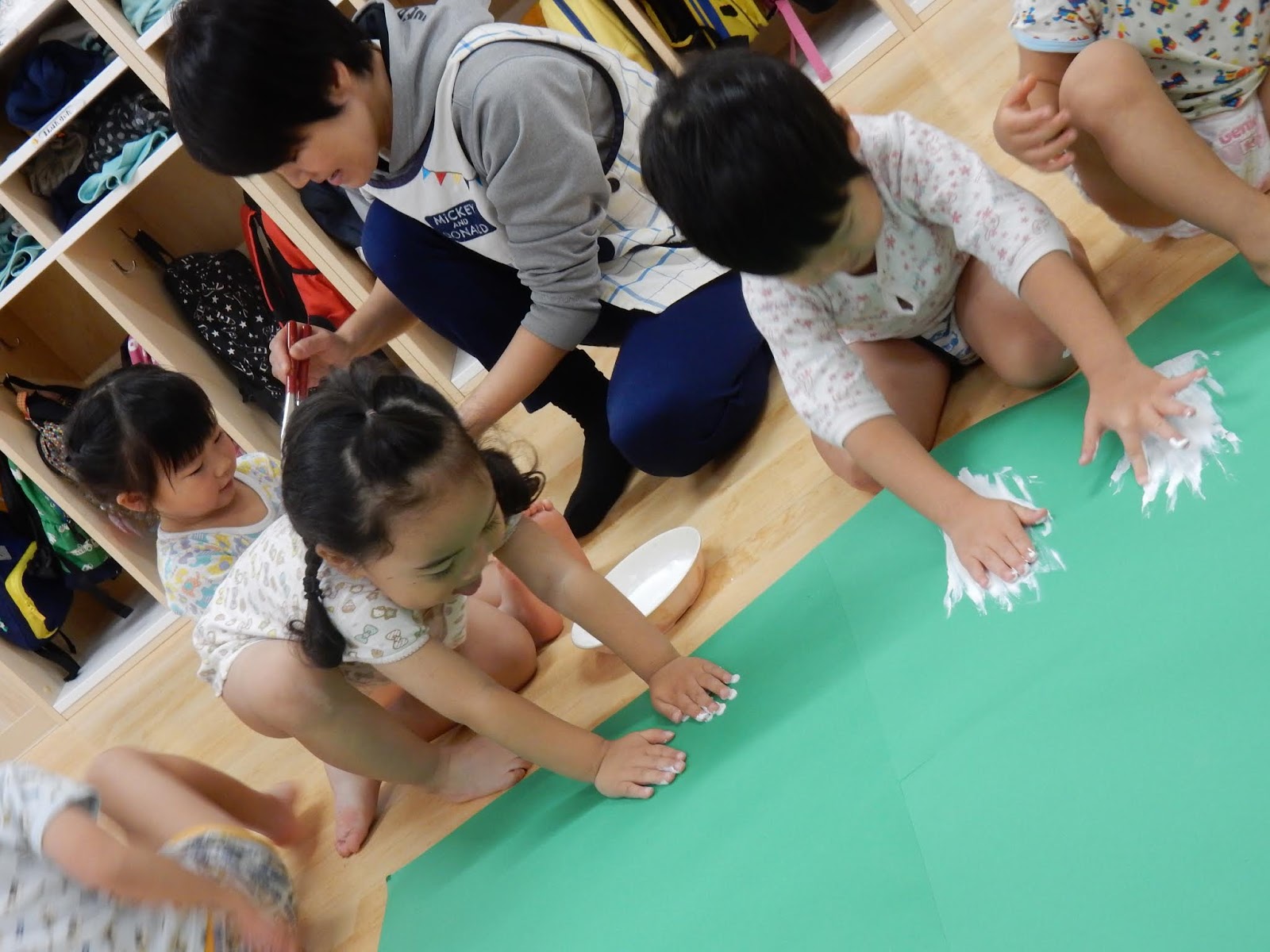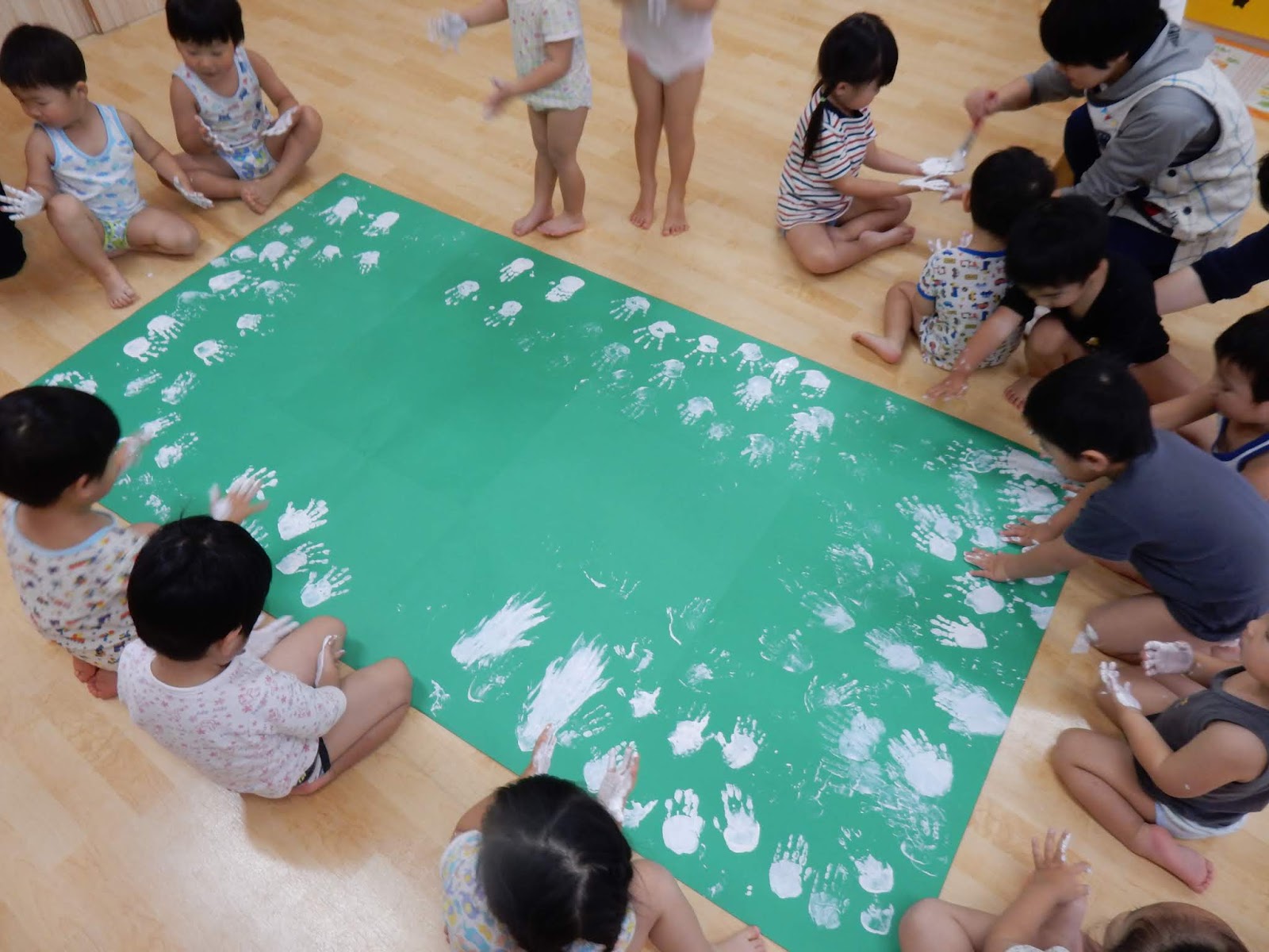 大きな画用紙にみんなで絵の具をペタペタ…手形がたくさん並びましたよ!服が汚れないように、シャツとパンツになっていたんですね!手に絵の具を塗ってもらうと、冷たくて、くすぐったくて、笑っちゃう子、ちょっと顔が引きつる子と様々でした。感じ方はそれぞれ違うので、“気持ちいい♬”と思える子、“イヤだな…”と言う子がいます。でも、楽しそうにお友達が遊んでいる様子や、手を開いて見せ合っている様子を見るうちに、やってみようかな…と思ってくれることもあります。その繰り返しで、苦手だったことができるようになることも♫みんなで模様を付けた画用紙が、1つの作品になって出来あがったら、きっとまた嬉しい気持ちになれますね!