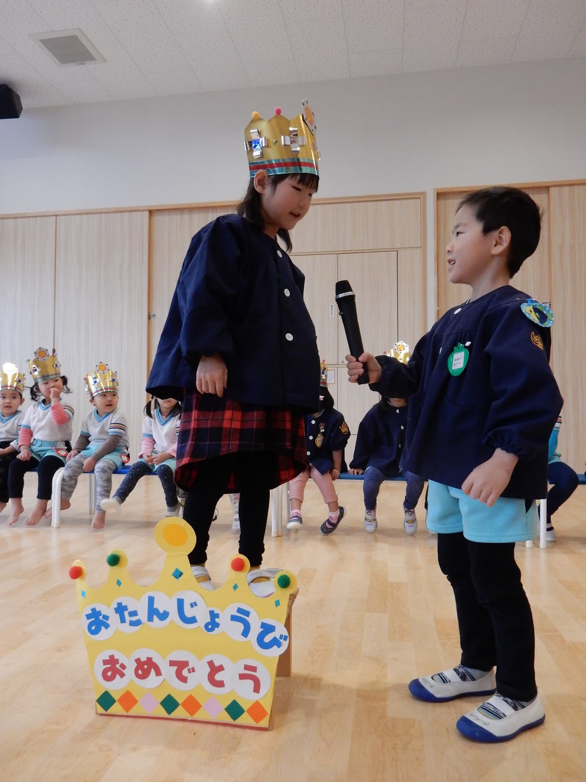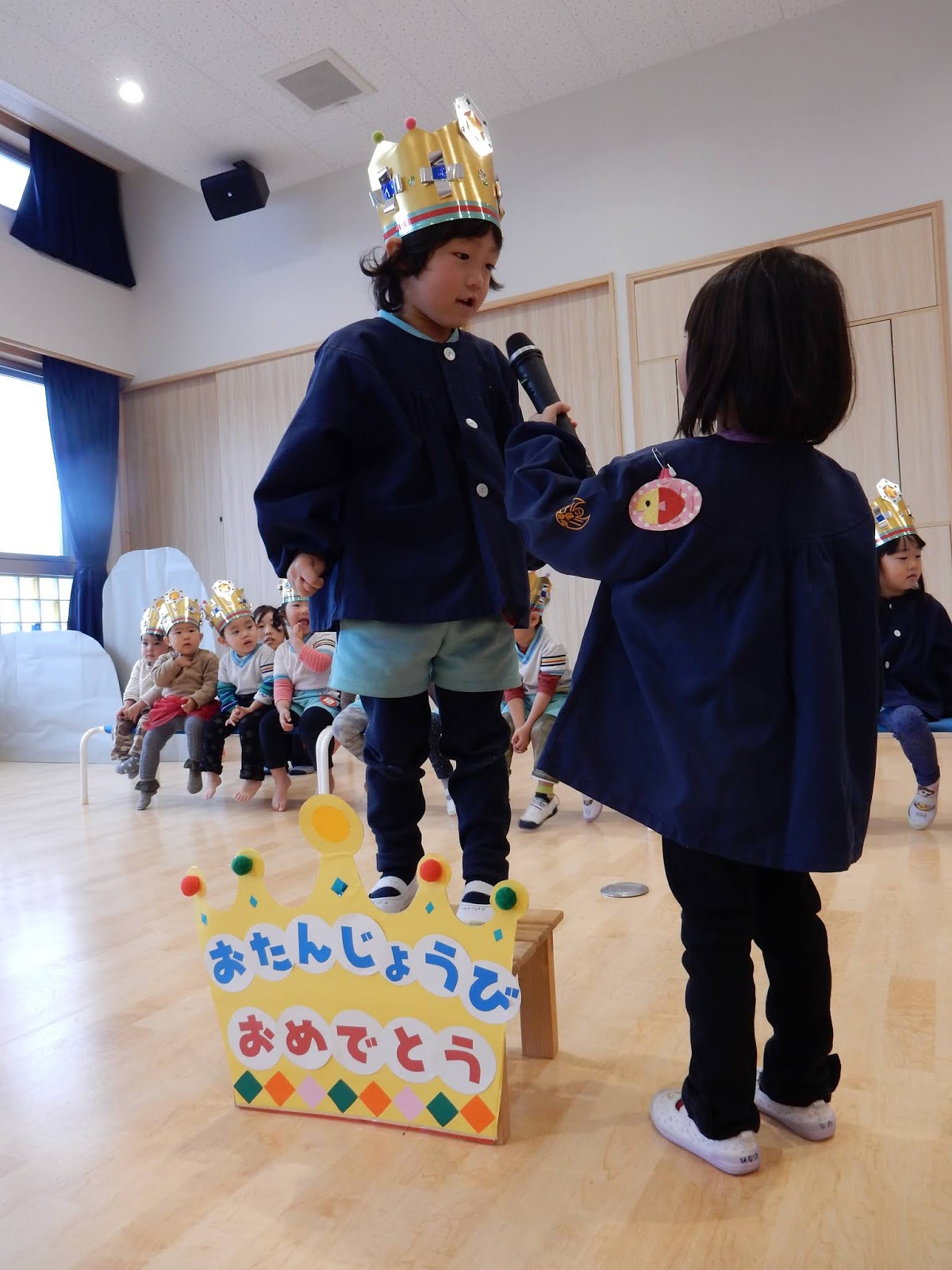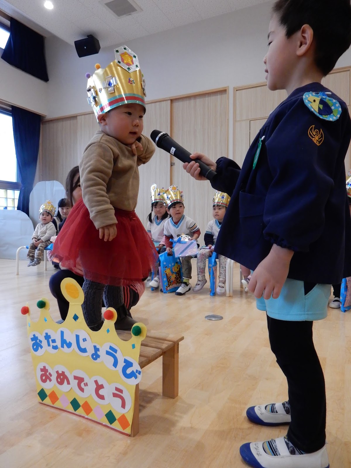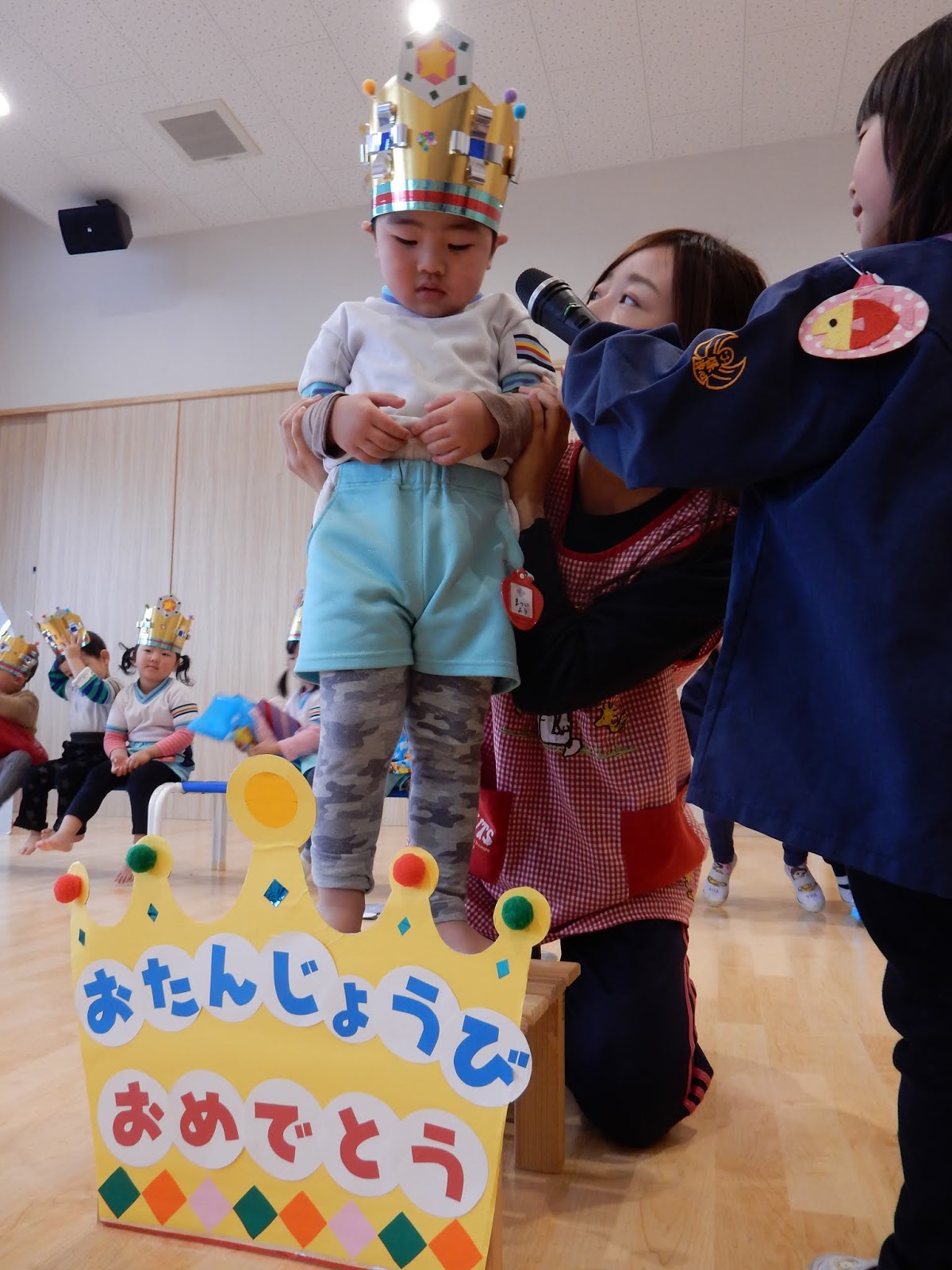 大きいクラスのお友達に手をひかれてひよこさんが入場したり、キラキラの冠に嬉しそうな笑顔を見せてくれたお誕生日のお友達。