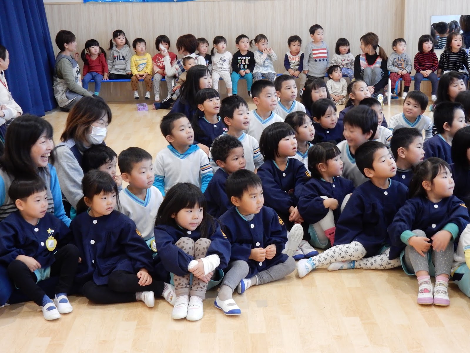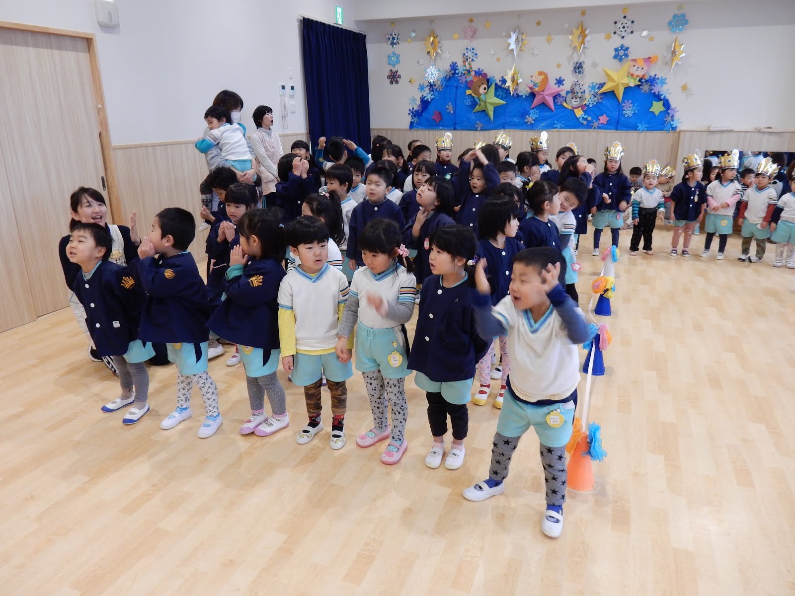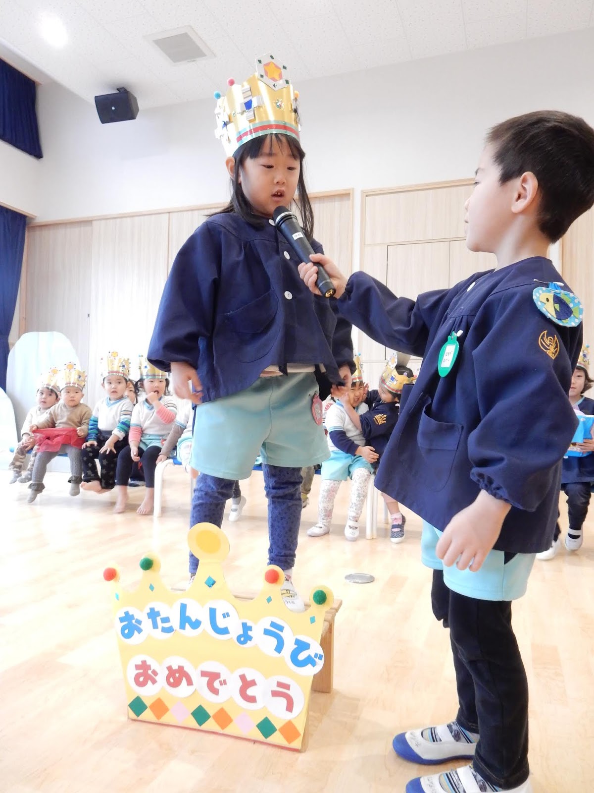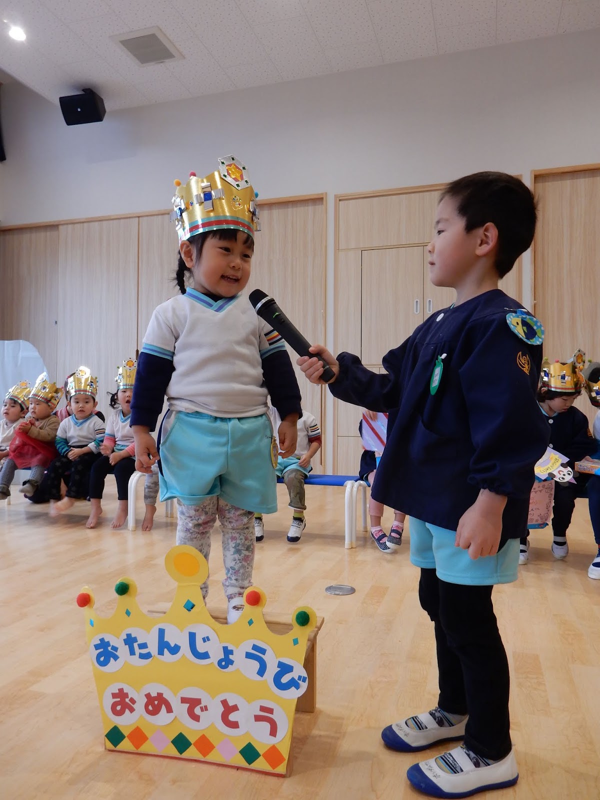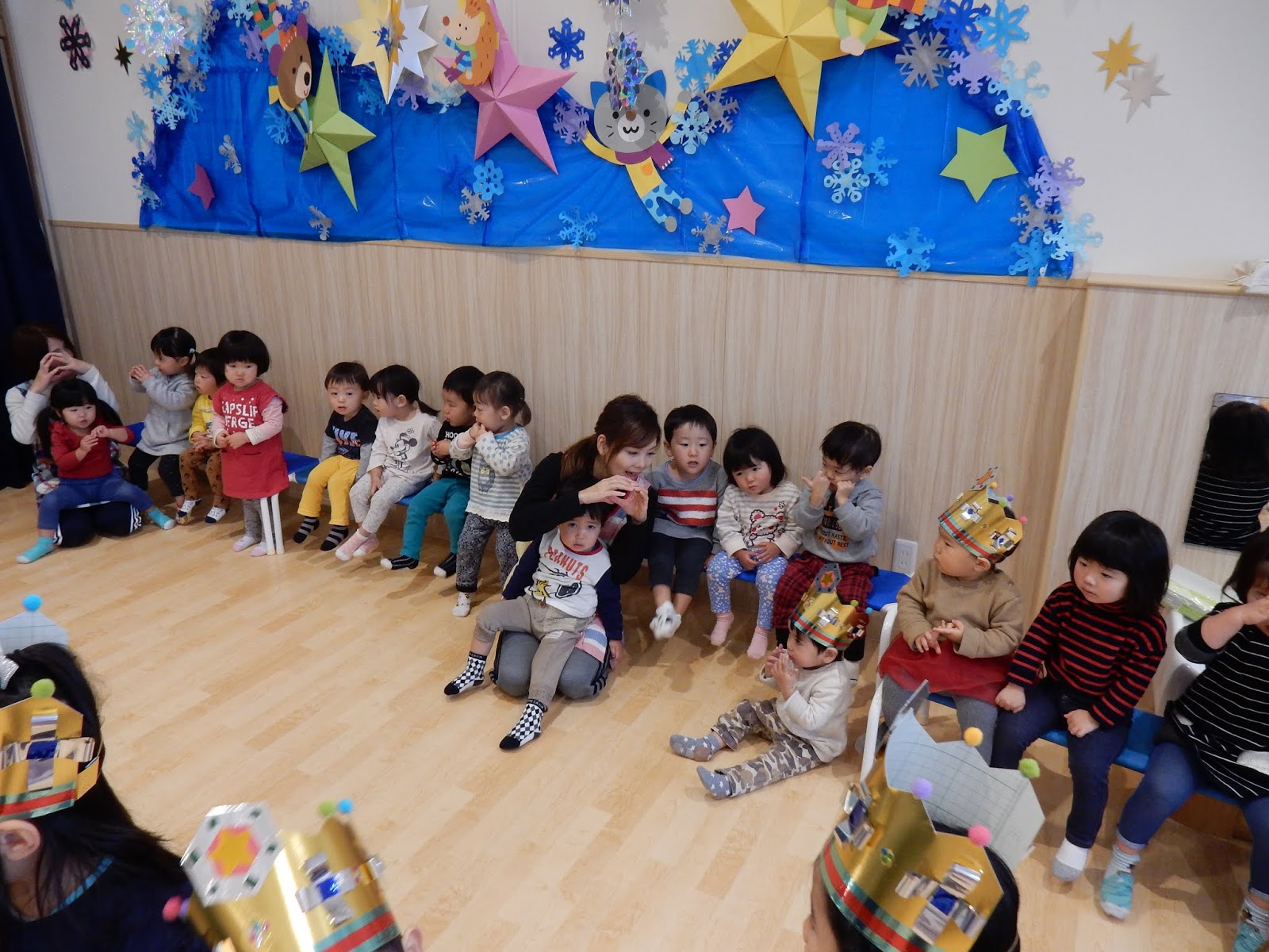 大きいクラスのお友達に手をひかれてひよこさんが入場したり、キラキラの冠に嬉しそうな笑顔を見せてくれたお誕生日のお友達。