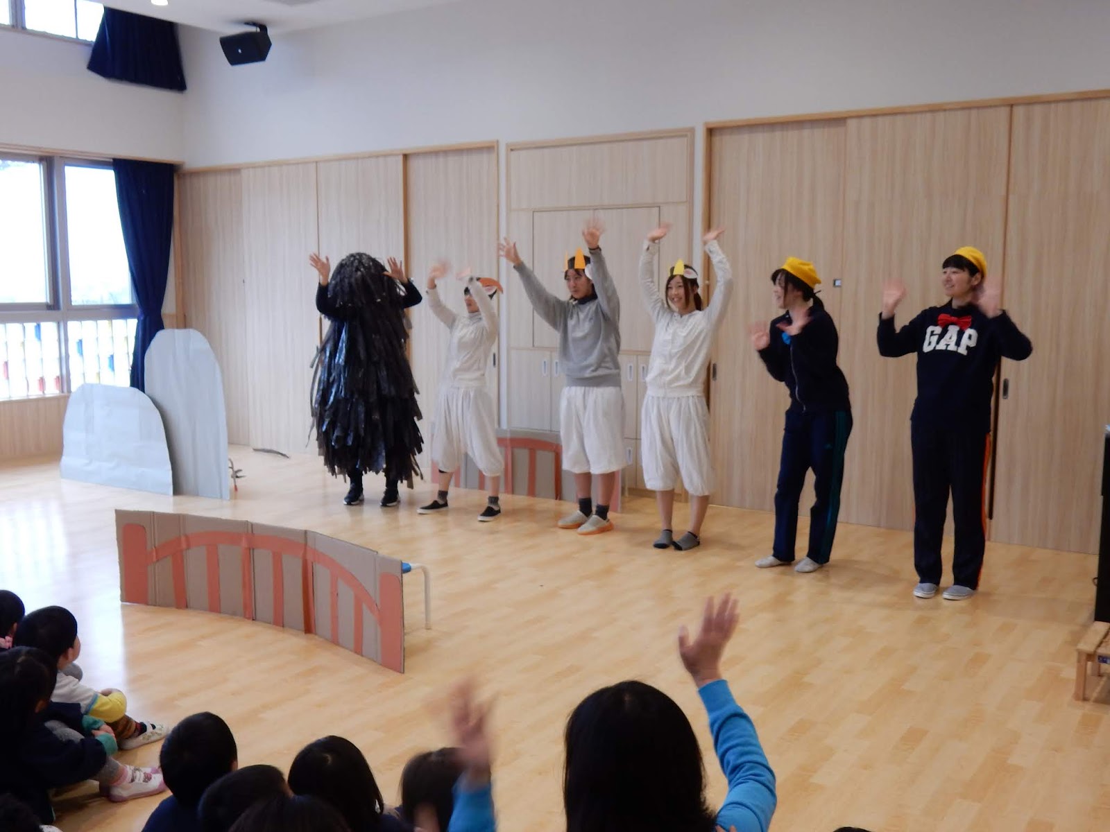ビックリして思わず手で顔を隠しながら見たり、先生の近くへ寄ってみるたんぽぽさん。大きいヤギと、トロルの戦いのシーンではみんな大興奮!楽しい発表会となりました。