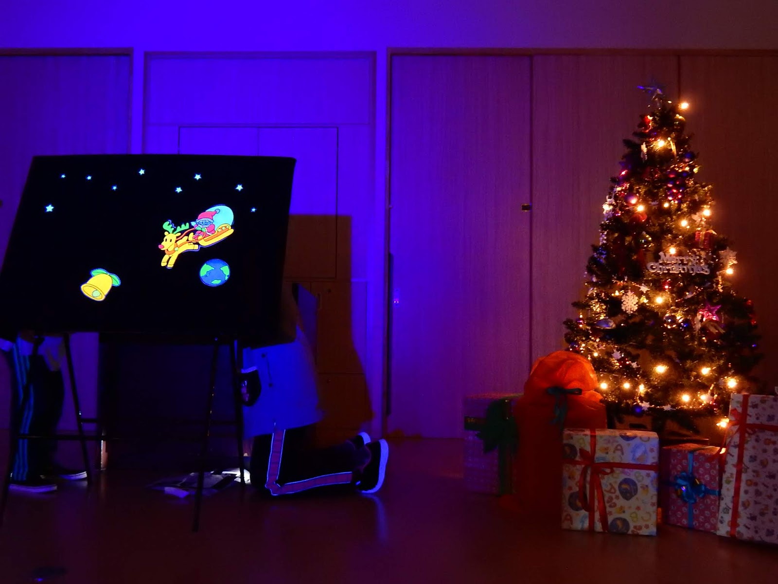 お部屋を暗くして、ブラックライトで光るパネルシアターに、エントランスに飾っていたツリーもピカピカ!ツリーの下には、サンタさんが持ってきてくれたのかな!?たくさんのプレゼントも並んでいます。お歌をみんなで歌いながらシアターを見終ると...