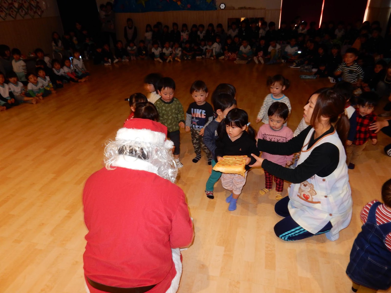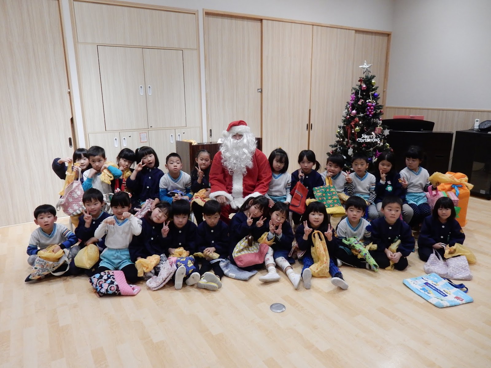 ひよこさんからひまわりさんまで、みんなが1つずつ手渡しでもらいましたよ。『ありがとう!』と元気にお礼を言える子もたくさん!みんな中身が気になって仕方ありません!(笑)この後にサンタさんと一緒に撮った集合写真も、プレゼントの袋を気にして下を向く子続出!(笑)一緒に写真を撮ったあとも、タッチをしてもらったり、お髭に触ったり、名残惜しそうにしているみんなでした。