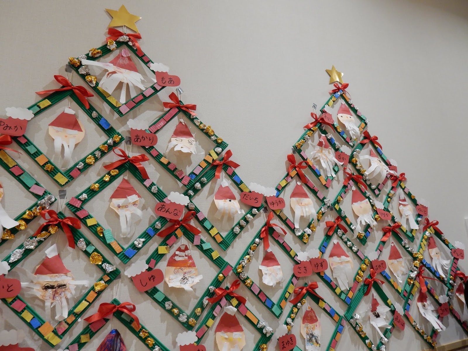 クラスごとに作った飾りは、リースや置き飾り。サンタさんの顔と様々。みんなの作ってくれた飾りは