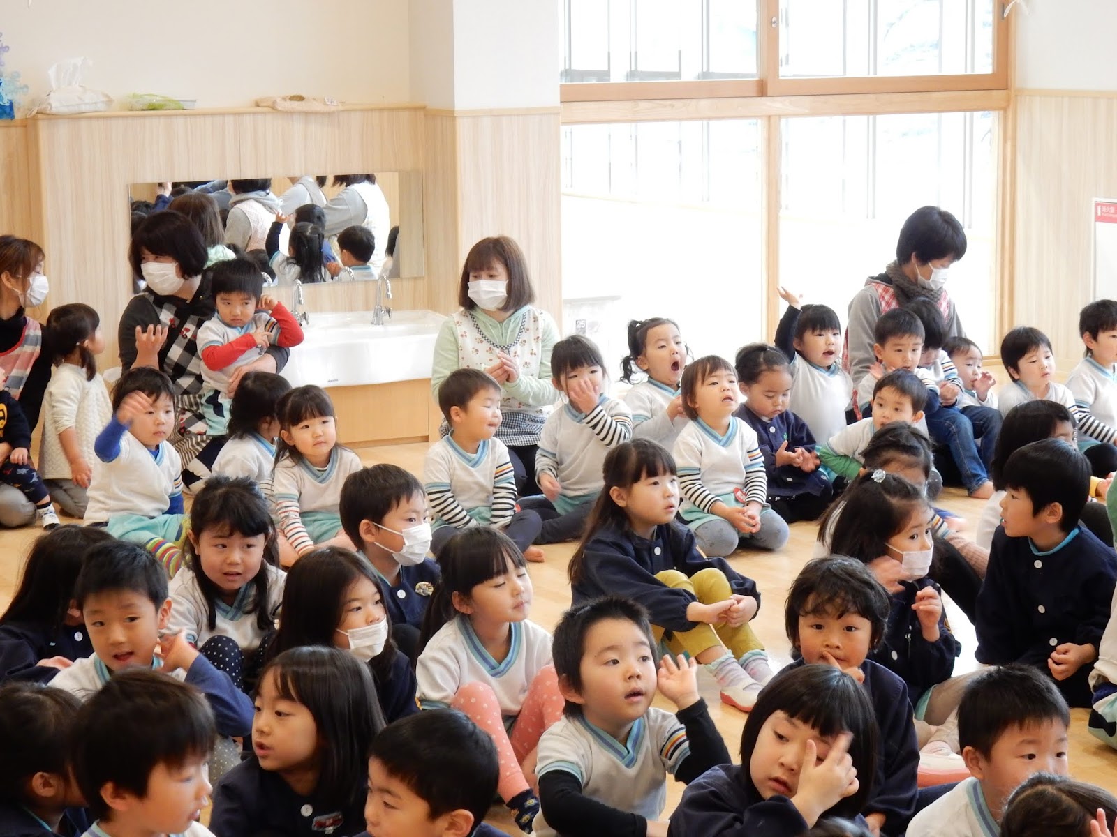 園長先生からは、今年の干支、イノシシのお話。一生懸命頑張ることの大切さや、素晴らしさ。頑張る姿は格好いいんだよ!というお話に、2月に控えている発表会に向けて、みんなで練習を頑張って行きましょう!と気合を入れました。