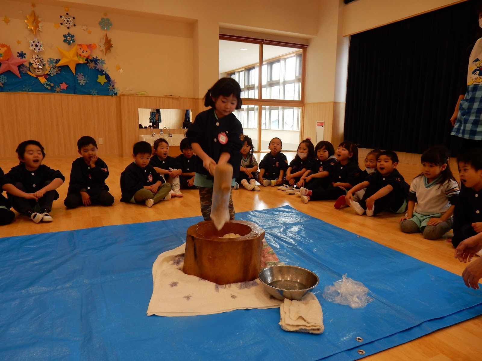 小さいクラスのお友達から順番にお餅をつきます。大きな杵を、重たそうに持ったかと思えば、一生懸命頭の上まで持ち上げて、勢いよくおろしたり、お友達の掛け声に合わせてテンポよくついたり、みんなとっても上手にやってくれましたよ!