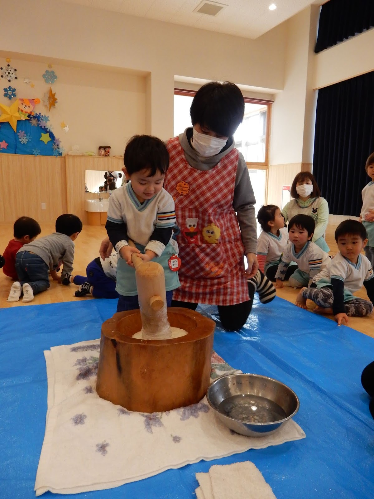新学期が始まって最初の行事となった今日のおもちつきは、まず楽しいペープサートから始まりました。今日は、いつも来て下さる“はいちーず”のカメラマンさんも撮影に来ていただいたので、行事の様子や、みんながお餅をつく様子はそちらでじっくりご覧くださいね!