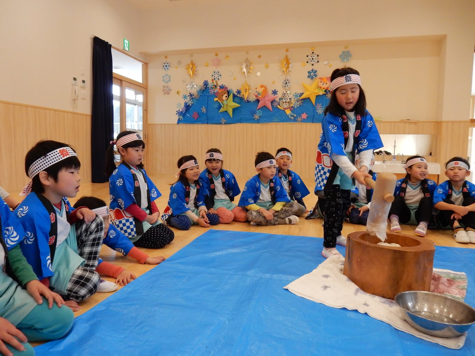お部屋でも練習していたもちつきの歌を元気一杯歌って、気合十分!いよいよおもちつきスタートです!