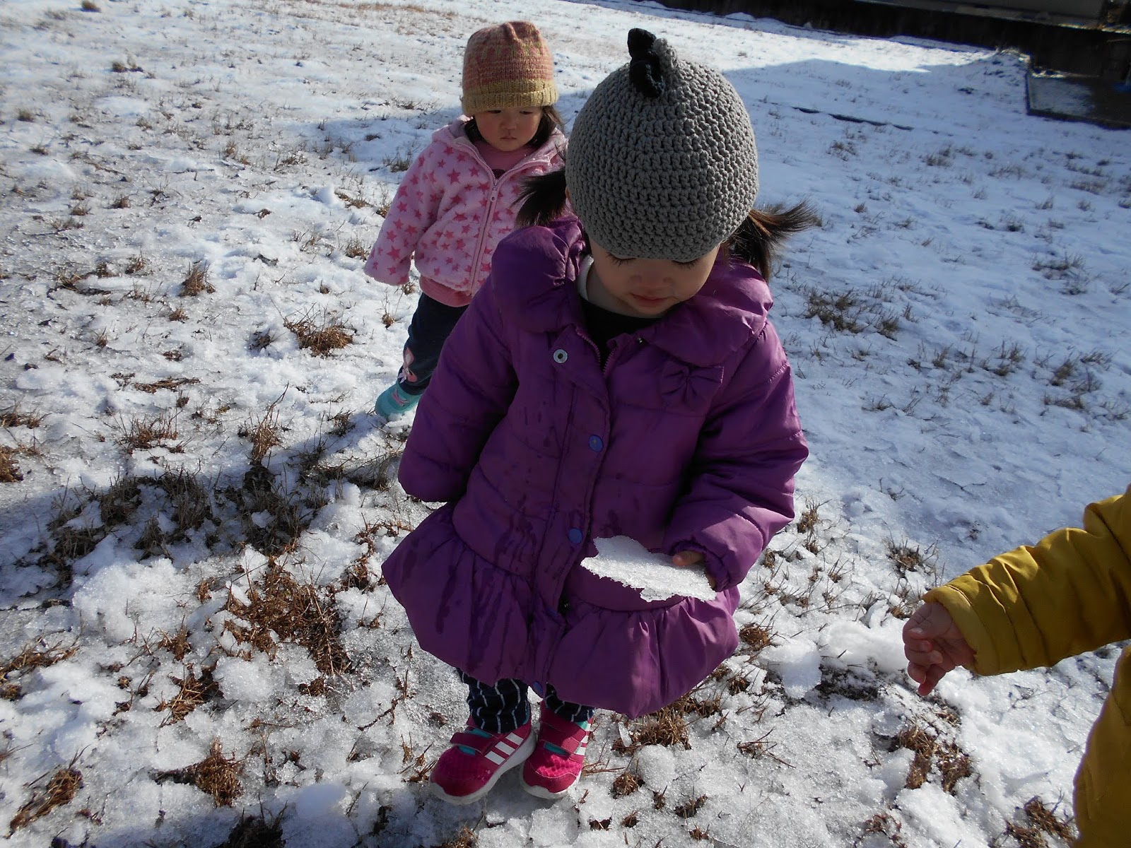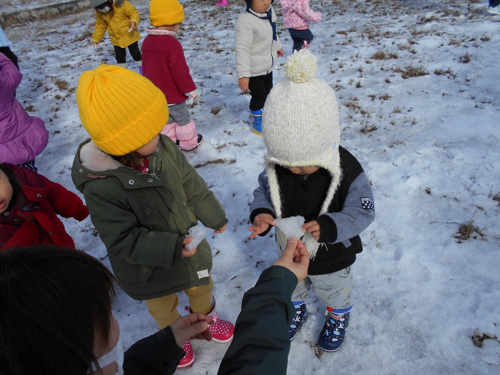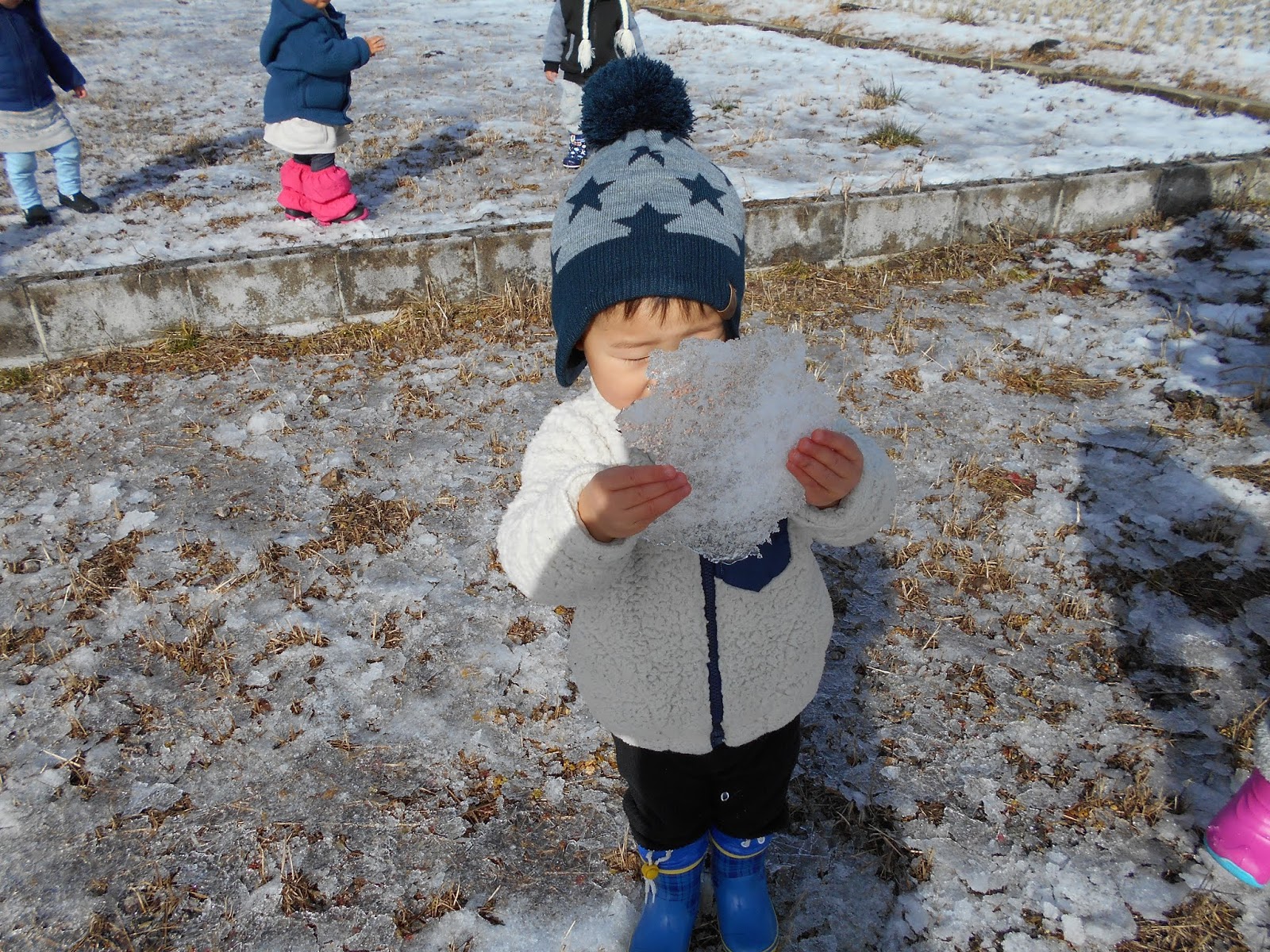 昨日降った雪が少し残り、今朝の冷え込みで凍っていたようですね。雪や氷の上を歩くだけでも、“ざくざく”と音を楽しんだり、長靴や靴の足跡を見て楽しむことができます。氷や雪の冷たさも、触ってみて初めて気が付く発見ですね。この時期ならではの自然の面白さを、たくさん伝えてあげたいですね。冬は寒いから、お部屋の中…ではなく、面白さに気がつけば、きっと子ども達は自然と外遊びが好きになると思います。まずは、大人も一緒に楽しい♬を感じたいですね!