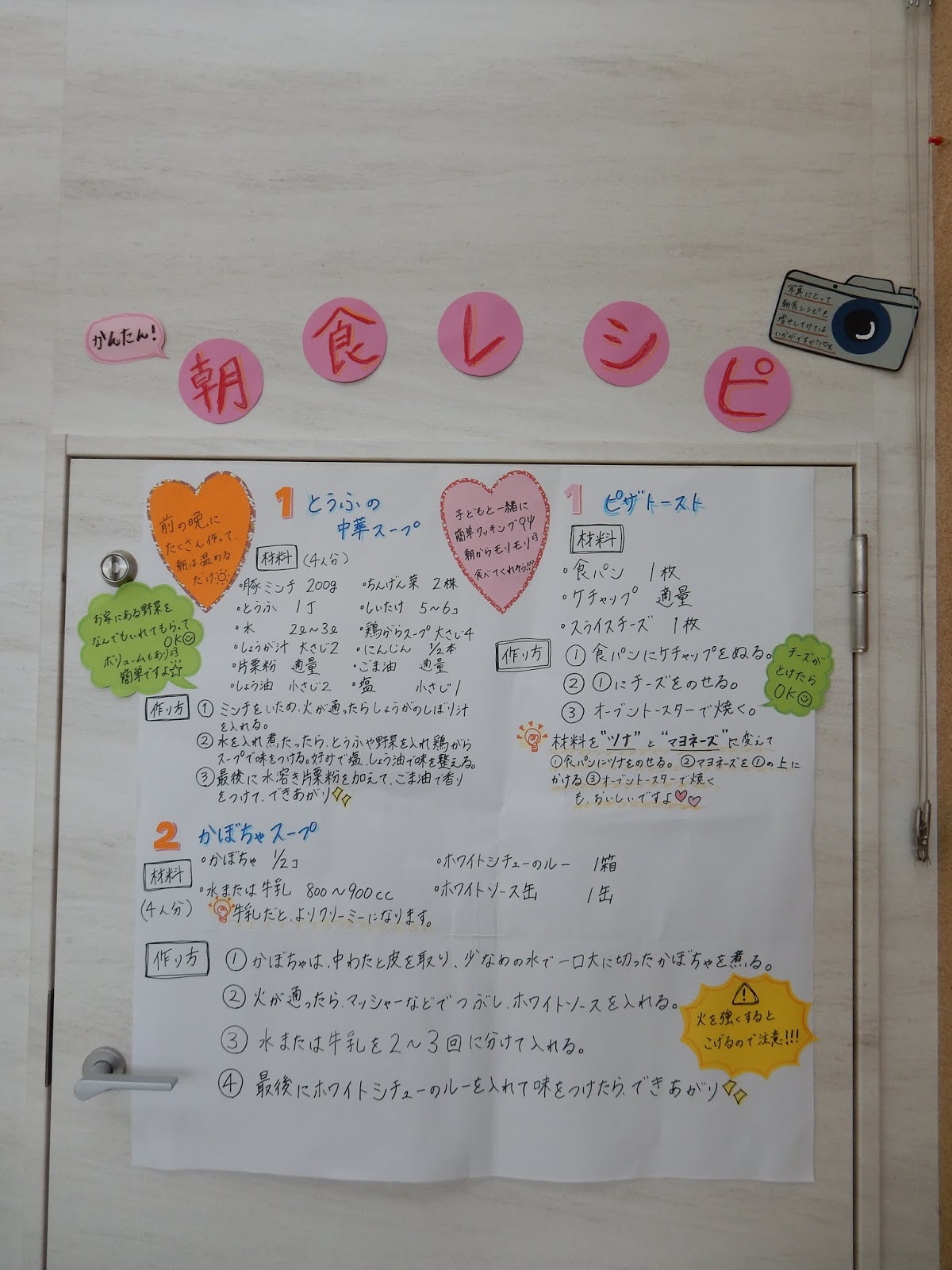 白鳥地域の学校保健連絡会で取り組んでいる『バランスのよい朝食』に関する取り組みとして、給食の先生から簡単にできるレシピを教えていただき、スープと、ピザトーストを紹介しています。ぜひ、参考にしてみて下さいね!