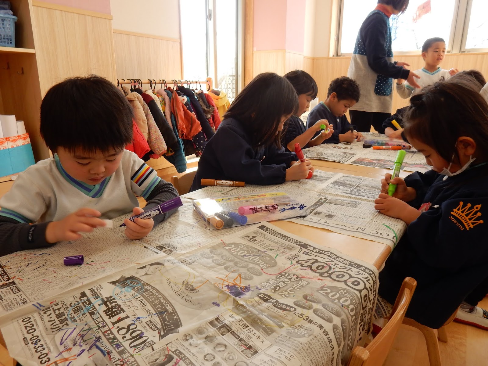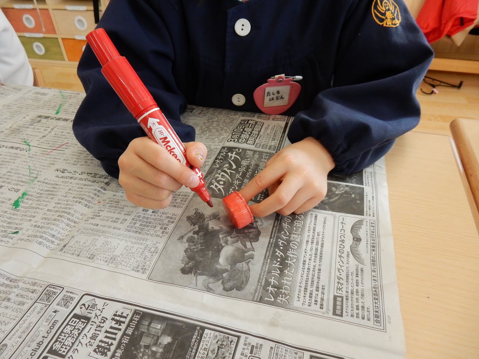 ゆりさんは製作をしていました。みんな真剣!なにをしているのかと手元をのぞいてみると、小さなペットボトルの蓋に、マジックで色を塗っていました。何になるかは、今後の製作を見てのお楽しみですね。身近にある素材での製作は、子ども達も意欲が高まります。“こんなものが、こんな風に変身するのか!”と、出来上がりも、より楽しみになりますね!