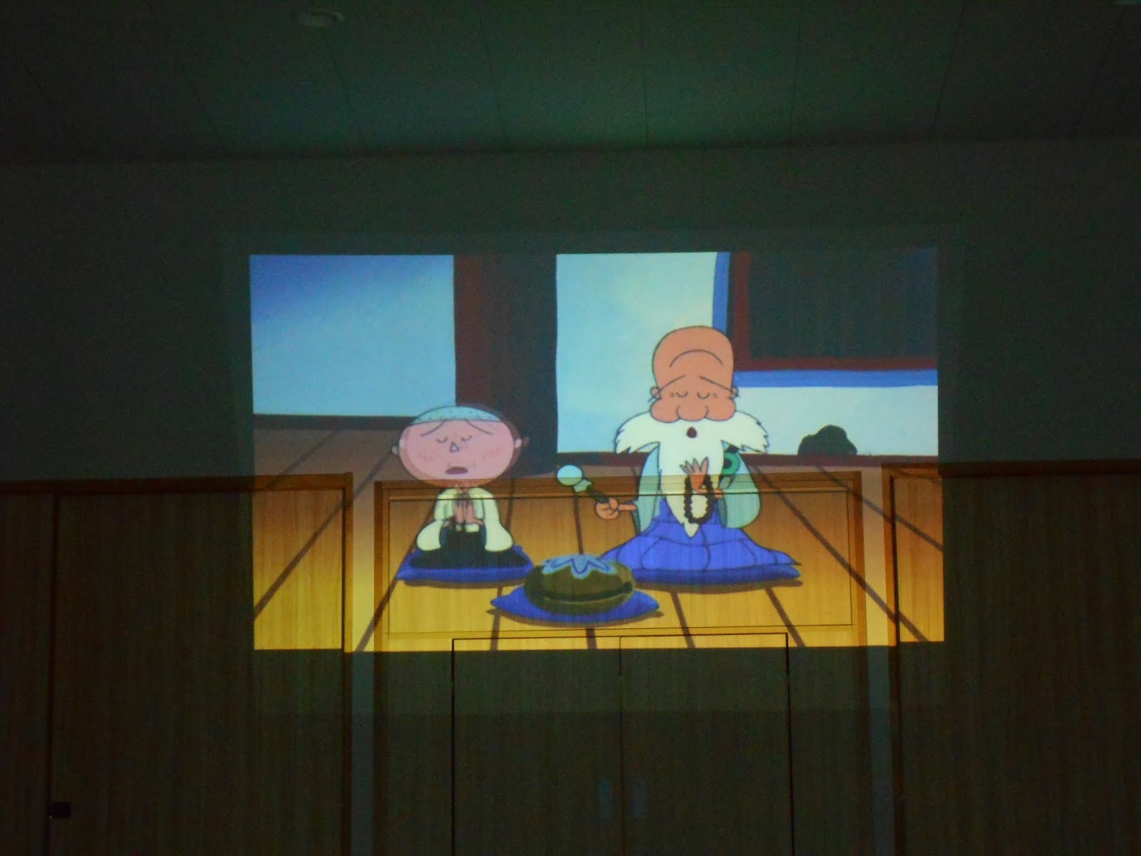 園長先生のお話の中で、「ロウソクはみんなの心を明るくします」「お線香はみんなの心をきれいにします」など話され、手を合わせて心を落ち着かせ姿勢を正し、静かな時を過ごす・・・と言う時間も大切なのでしょうね。 そして、日本昔ばなしから「三枚のお札」のDVDを見ました。