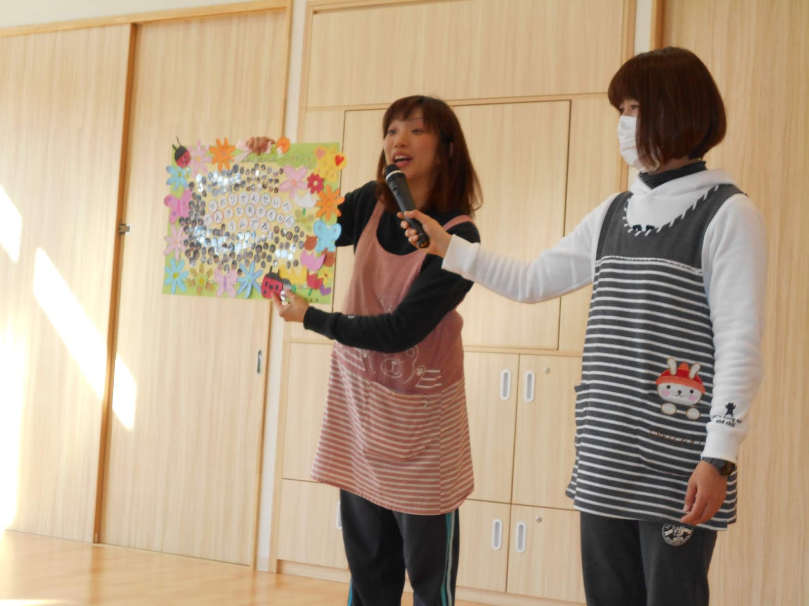 の、応援の掛け声とお花畑の中にみ~んなの顔写真が貼ってある絵のプレゼントを渡しました。
