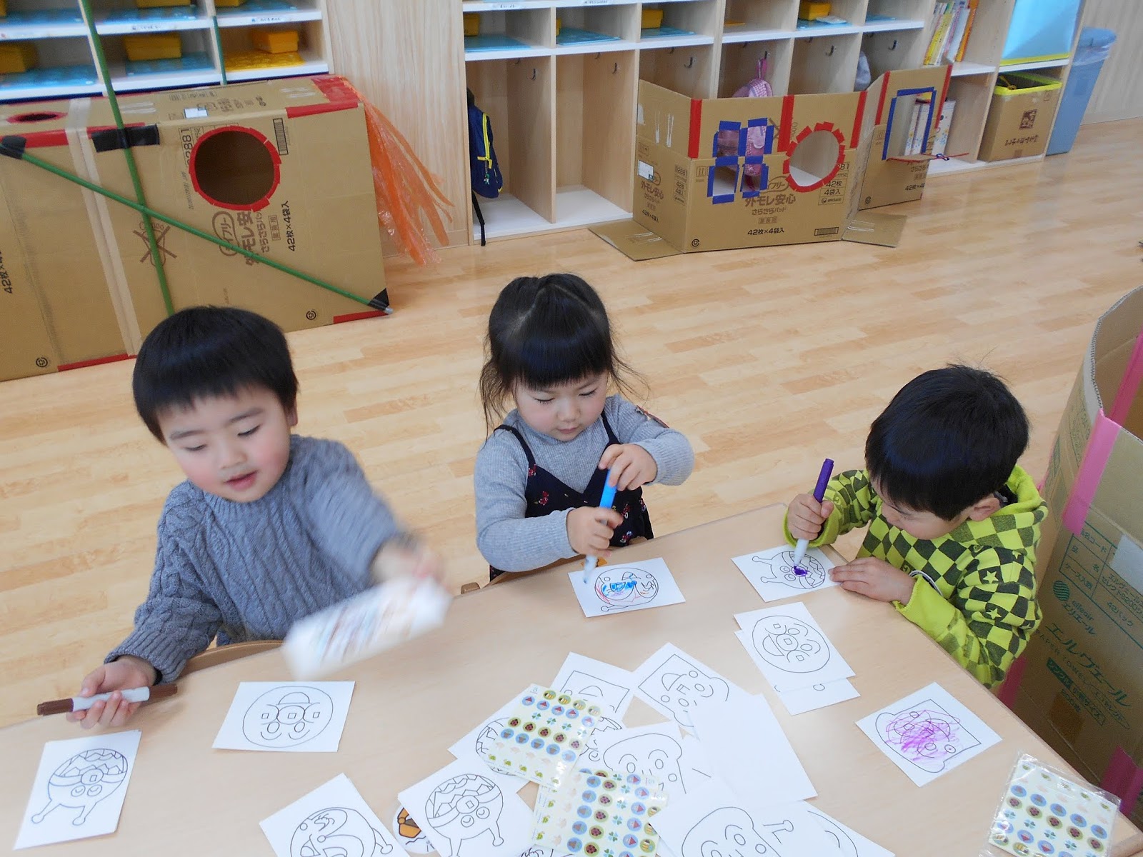 すみれさんは、お休みのお友達が多くてちょっと淋しいですが、マジックでぬりぬりしたり、シールを貼ったりしました。