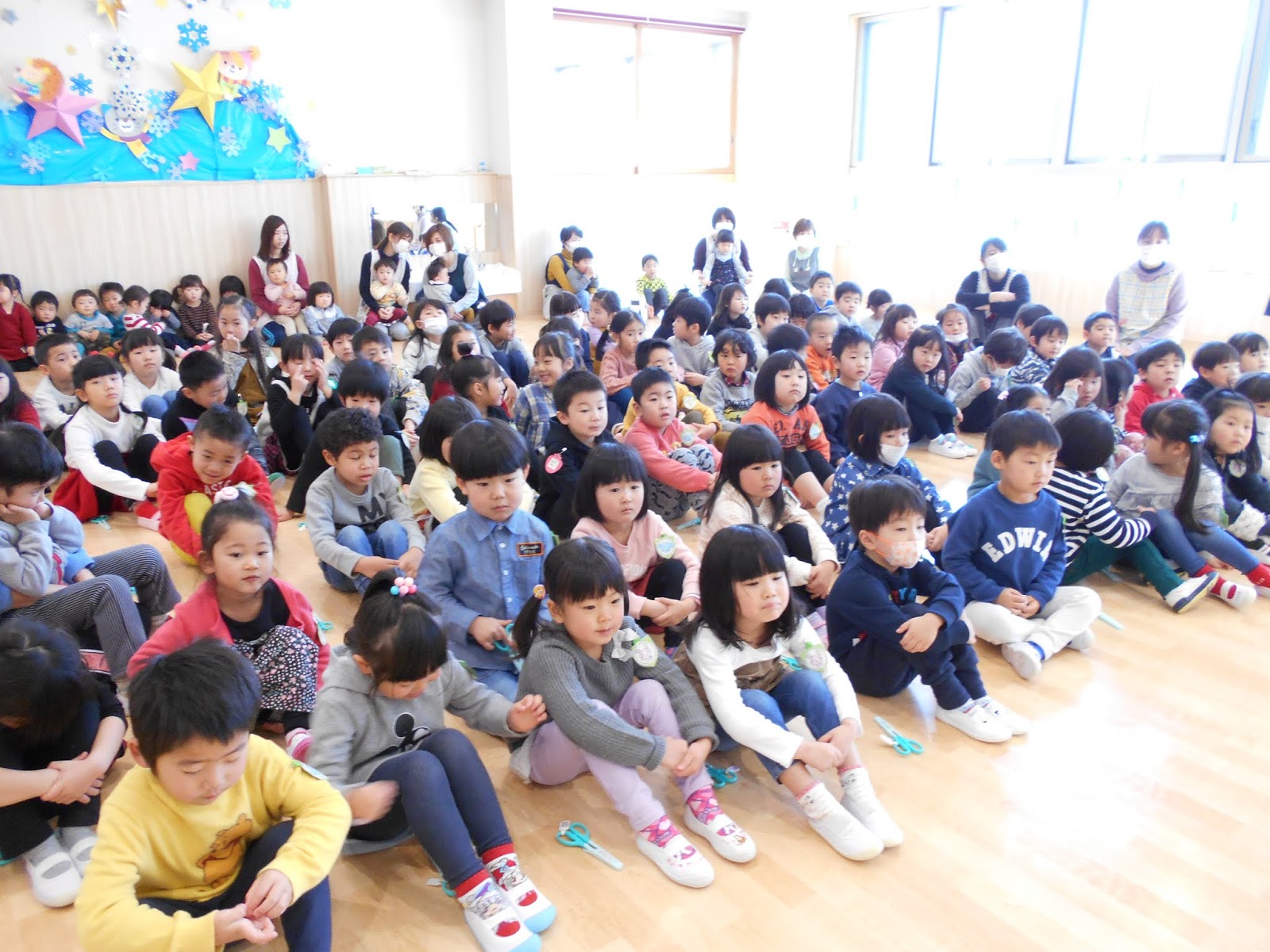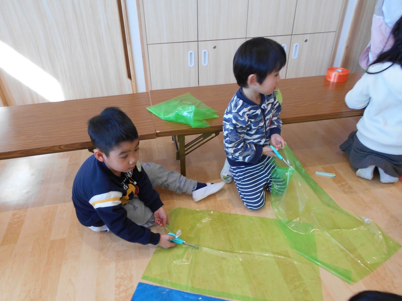 今日のわいわいデーは、ひみつ基地作り!!今日のひみつ基地作りでは、みんな”はさみ”を使って作るので大事なお約束のお話をしっかり聞きました。真剣に聞いていますね。
