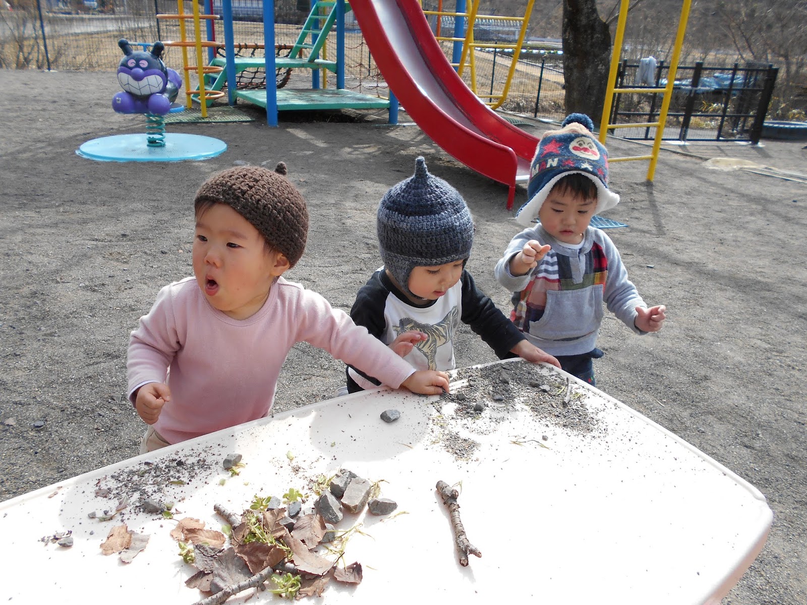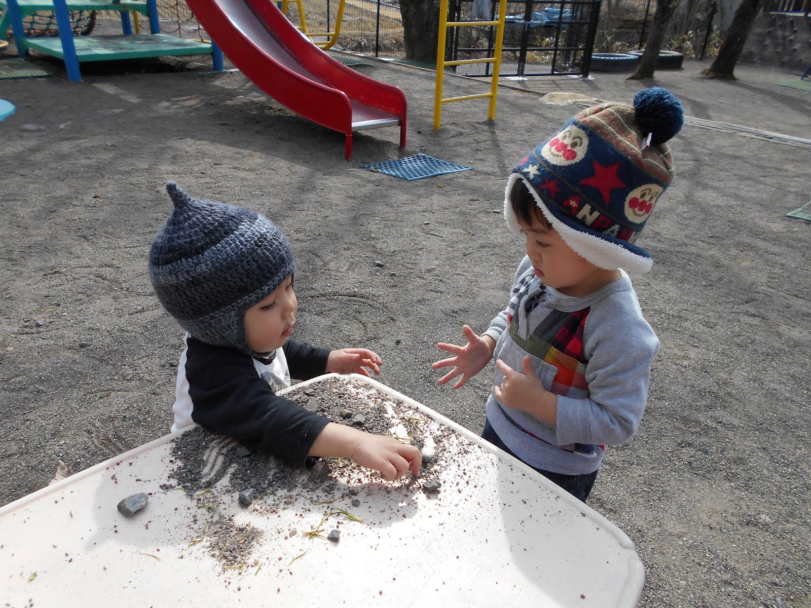 今日もいい天気☼上着なしでもいいくらいの気候~。ひよこさんが外遊び。砂を触って砂の感触を味わっていますね。