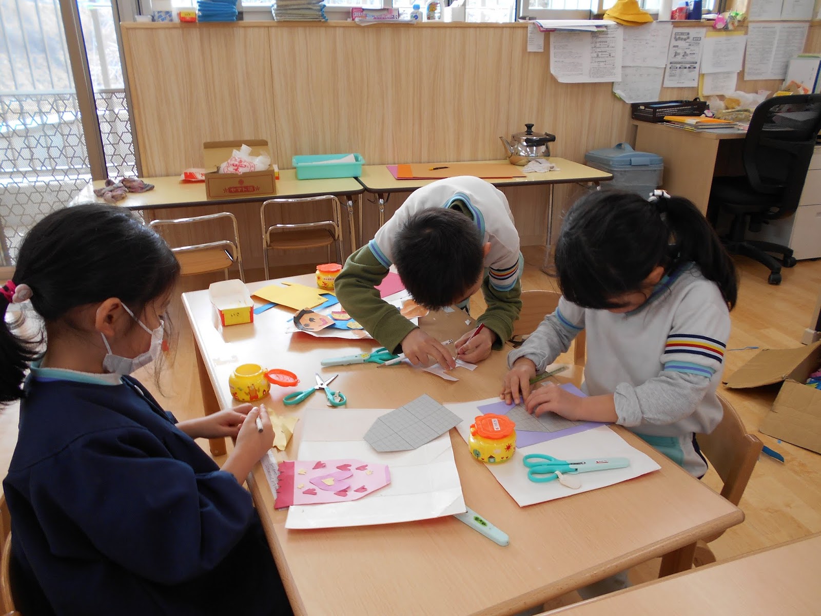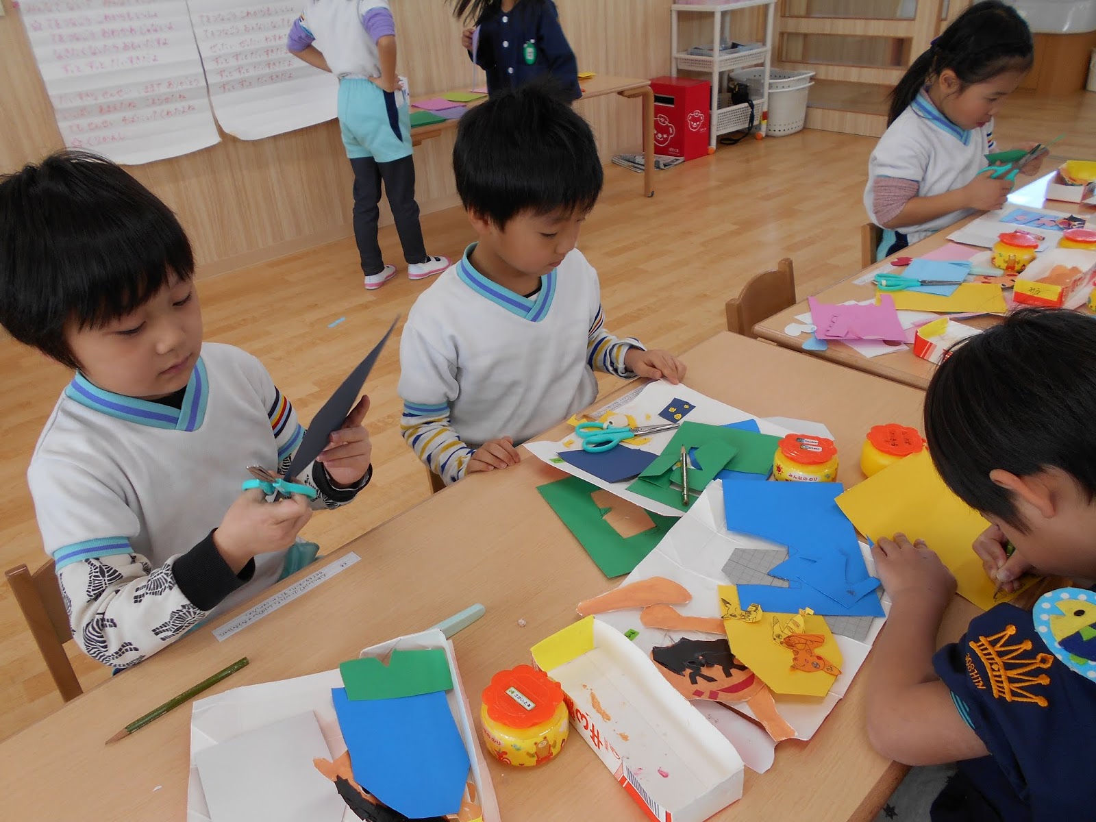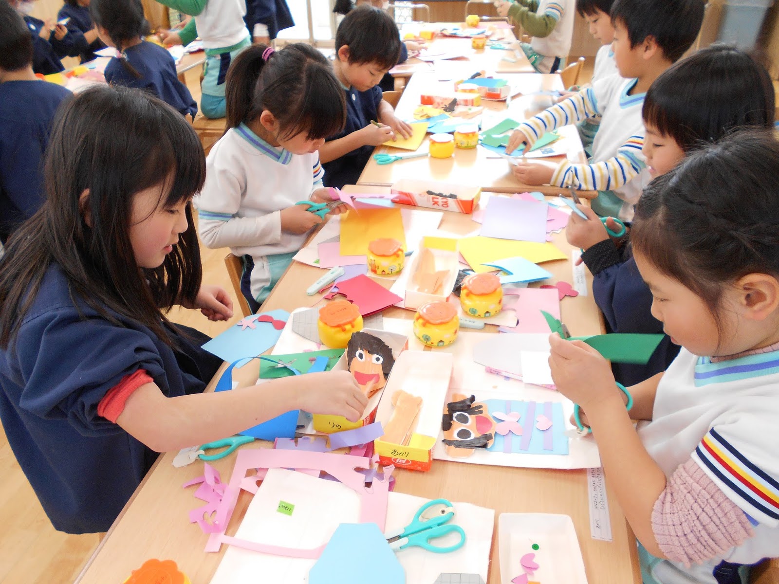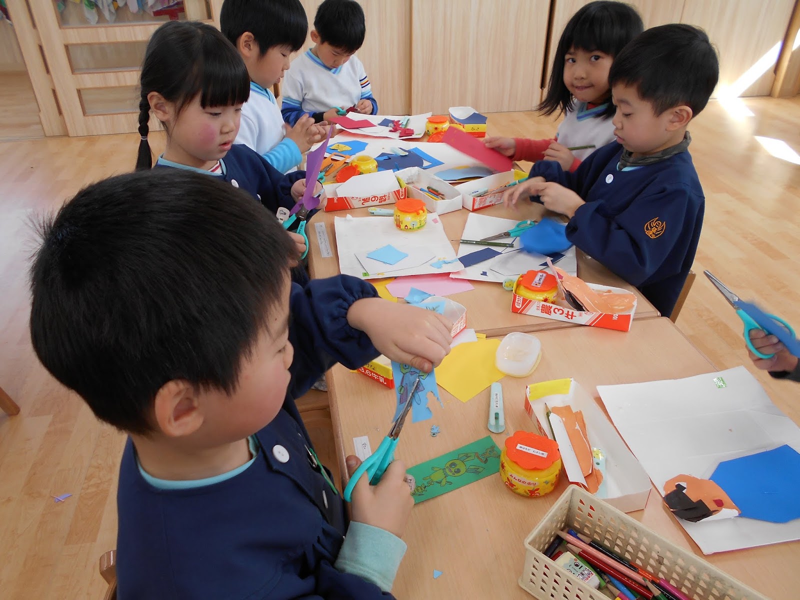 ひまわりさんともなれば、黙々と集中して作り始めてます。自分で服の型抜きを鉛筆でなぞって、それをはさみで切って、のりで貼って、・・・それぞれが色々な発想をし色々な形に作りあげ、「見てぇ~!」と出来上がった時の満足感いっぱいの笑顔がいいですね。