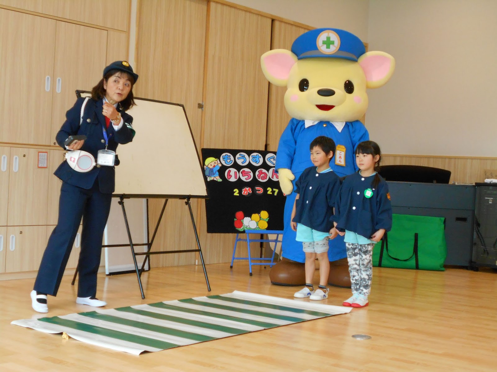 コアンちゃんが帰った後に、次はおまわりさんの登場です。みんなが横断歩道を渡る時の右手がピシッとあがっていたかどうか・・・「浄心こどもの城のみんな、ピシッと右手をあげていたので”合格”です」と言われました。良かったね~。