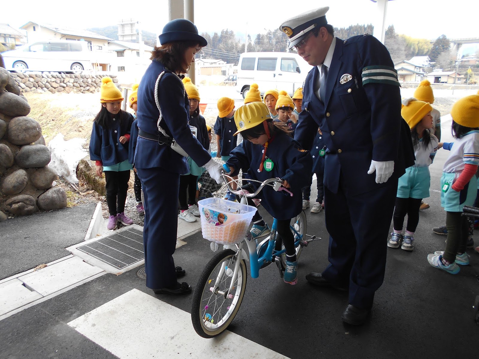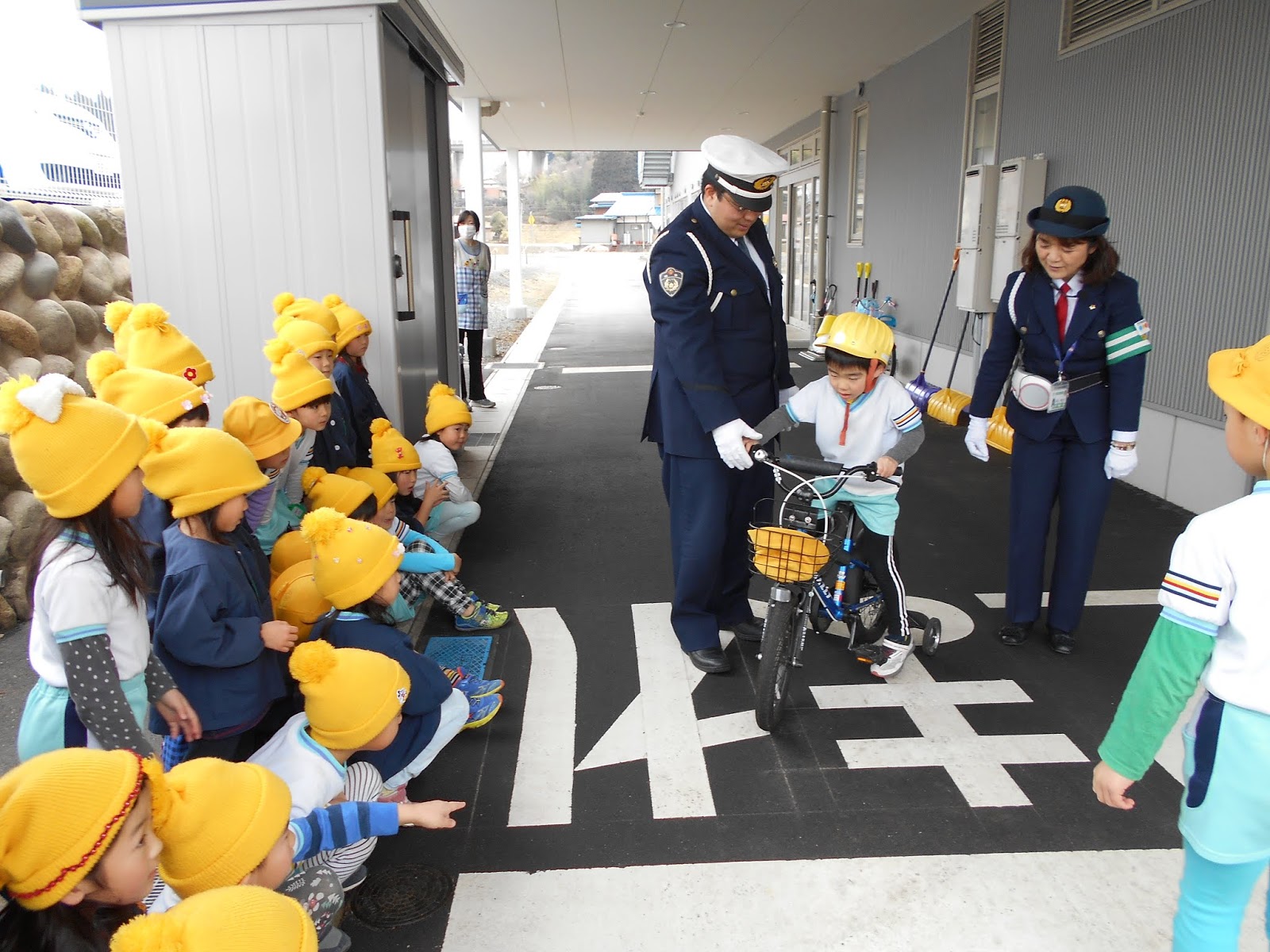 自転車は、移動手段でこれからどんどん乗る機会が増えていくと思いますが、今は、自転車に上手に乗れるように頑張ってくださいね。と、おまわりさんのお話で交通安全指導が終わりました。ひまわりさん、今日の大事なお話を忘れないで交通安全に気を付けて小学校へ行ってね!
