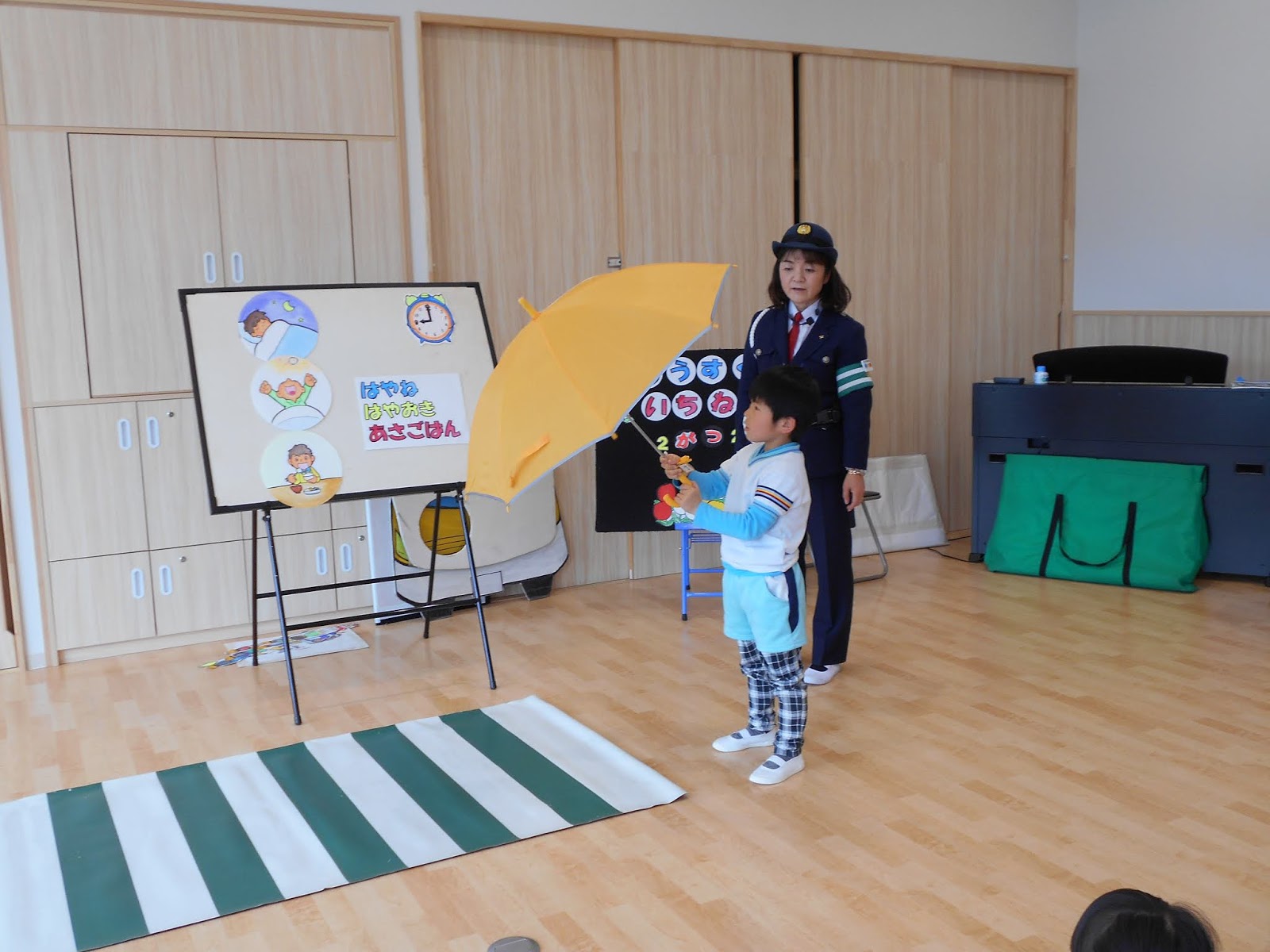 そして、今回は年長のひまわりさんだけの交通安全指導も行いました。この4月から小学校へ入学します。朝は何時に起きますか?早寝早起き朝ごはん・・・などの生活習慣の話などのお話もされました。
