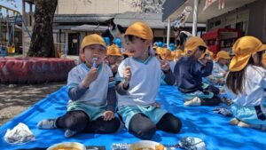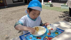 そして今日は、ゆり・ひまわり組さんでお外でお給食を食べました!!