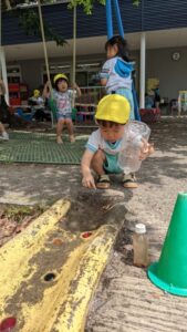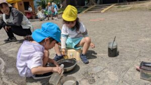 砂場遊びは、黙々と遊ぶ時もあれば、その時その時でお友だちと一緒になって遊ぶ場面もあります。