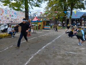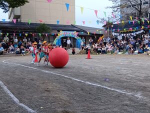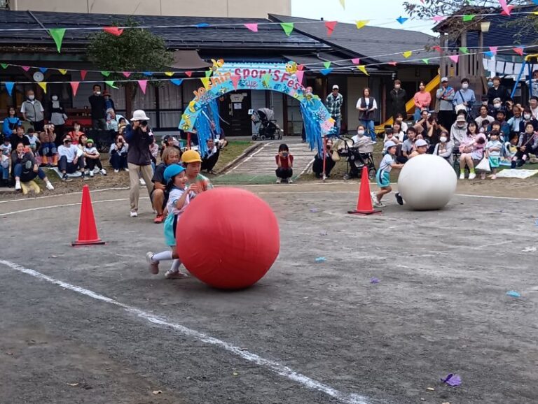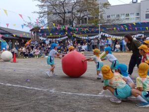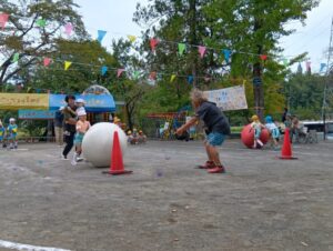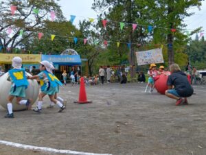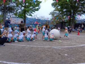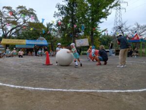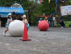 ゆり・ひまわり組の大玉ころがしは、2人で協力し合って頑張りました!!