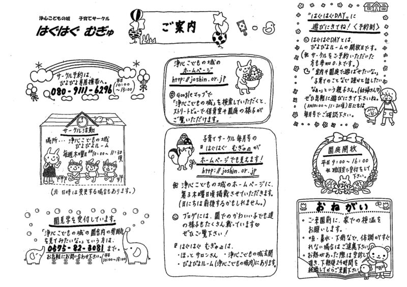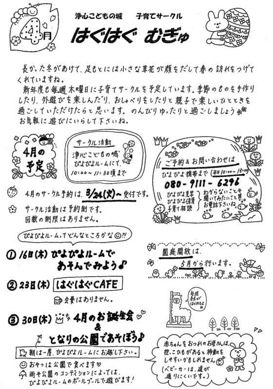 2026.03.19 〈2026年4月〉子育て支援のご案内 新しい出会いと始まりに胸がふくらむ4月。やわらかな春の陽ざしの中で、子どもたちの世界がぐんと広がる季節です。浄心こどもの城に、楽しいひとときを過ごしにきませんか? はぐはぐむぎゅ(2026年4月号)←プリント用PDF
