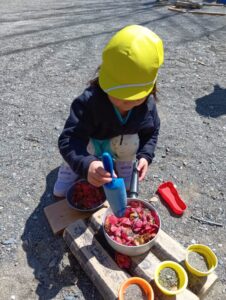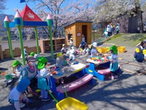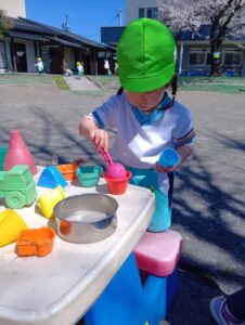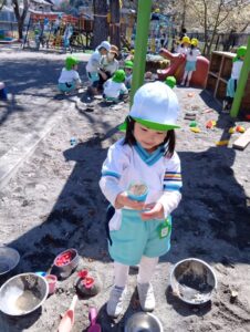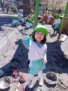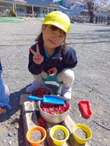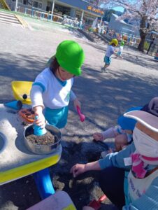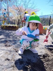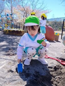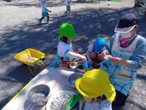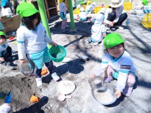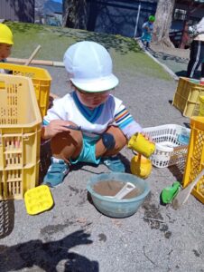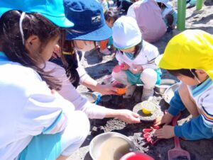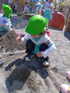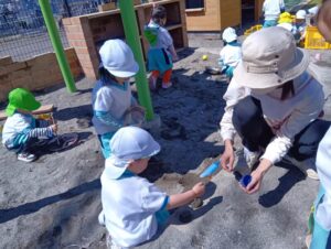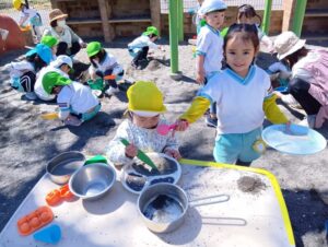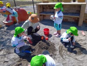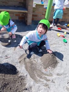 砂の感触、スコップやシャベルなど使ってお山作り、水と混ぜて泥だんご作り、先生やお友だちと遊んだり、たくさんの事が学べる場所です。