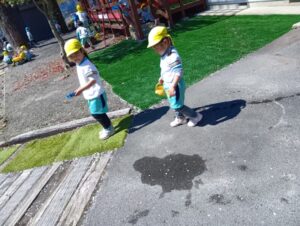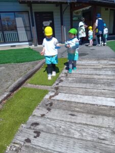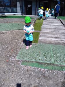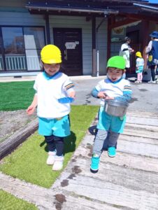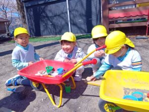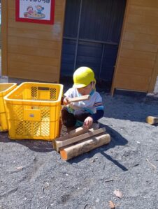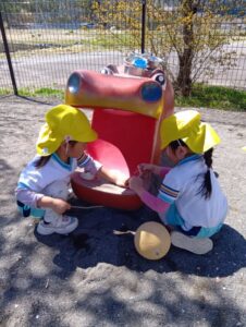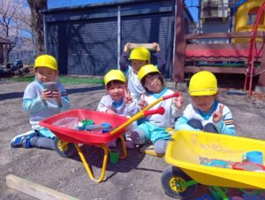 お砂場から離れて、仲間を作って、遊びを広げていってます。