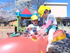 お店屋さんごっこなどの見たて遊びで、お友だちと一緒に役を振り分けたりする遊びを楽しんでいます!