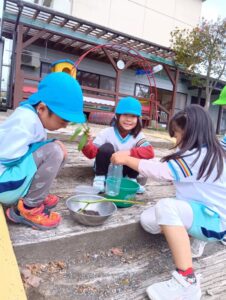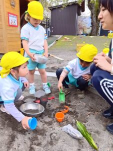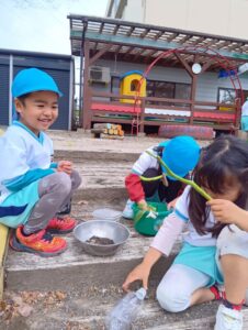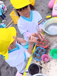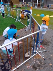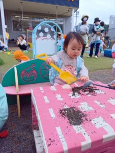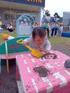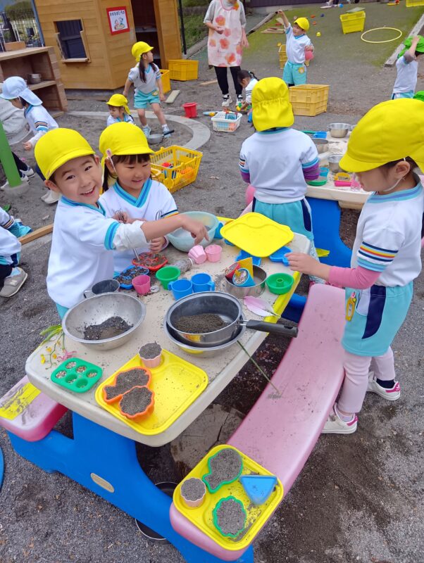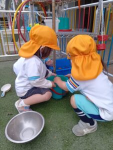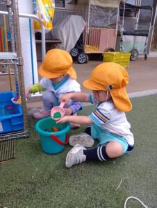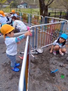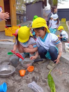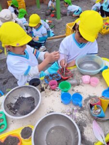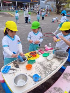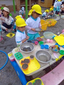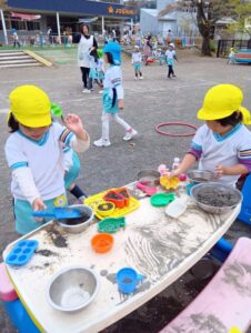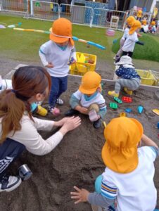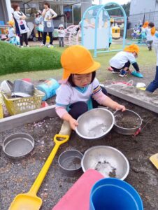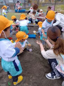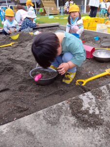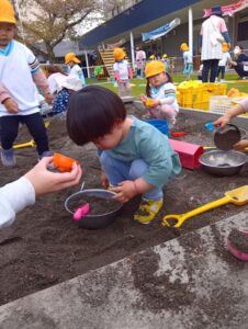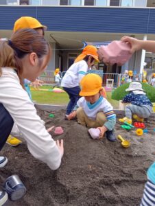さあ、小さいひよこ組とすみれ組さんも、お砂場遊びを楽しんでいます!