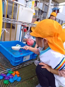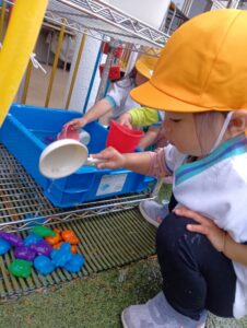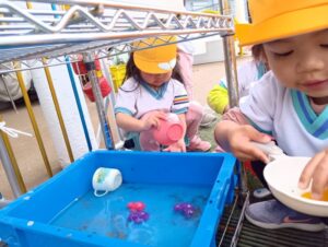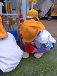 バケツにお水を入れてもらうと、さっそく水遊びがはじまります。